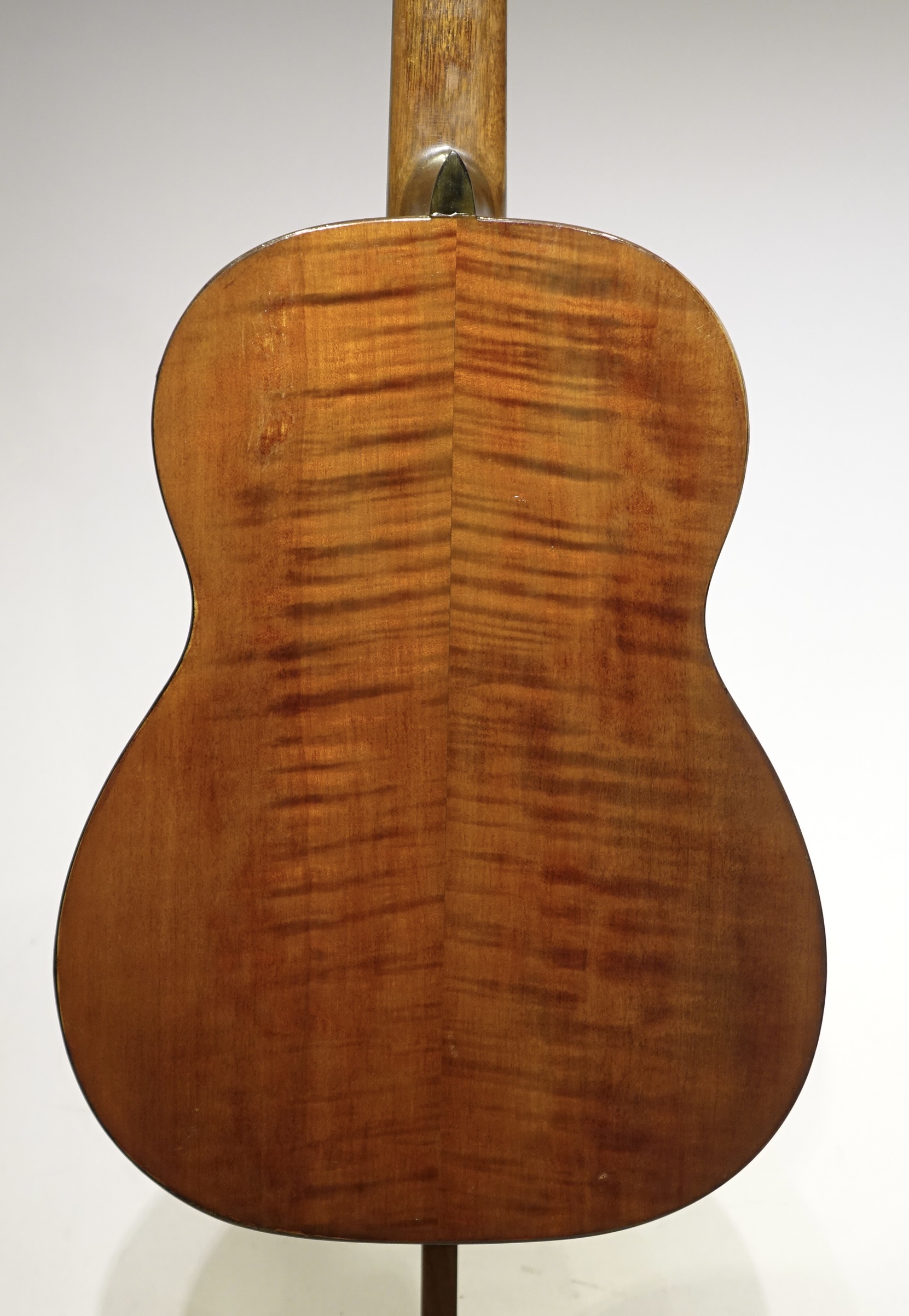 ネックはかなり薄く作られて、横・裏板にはトラ杢模様のメイプル材を使用しています。