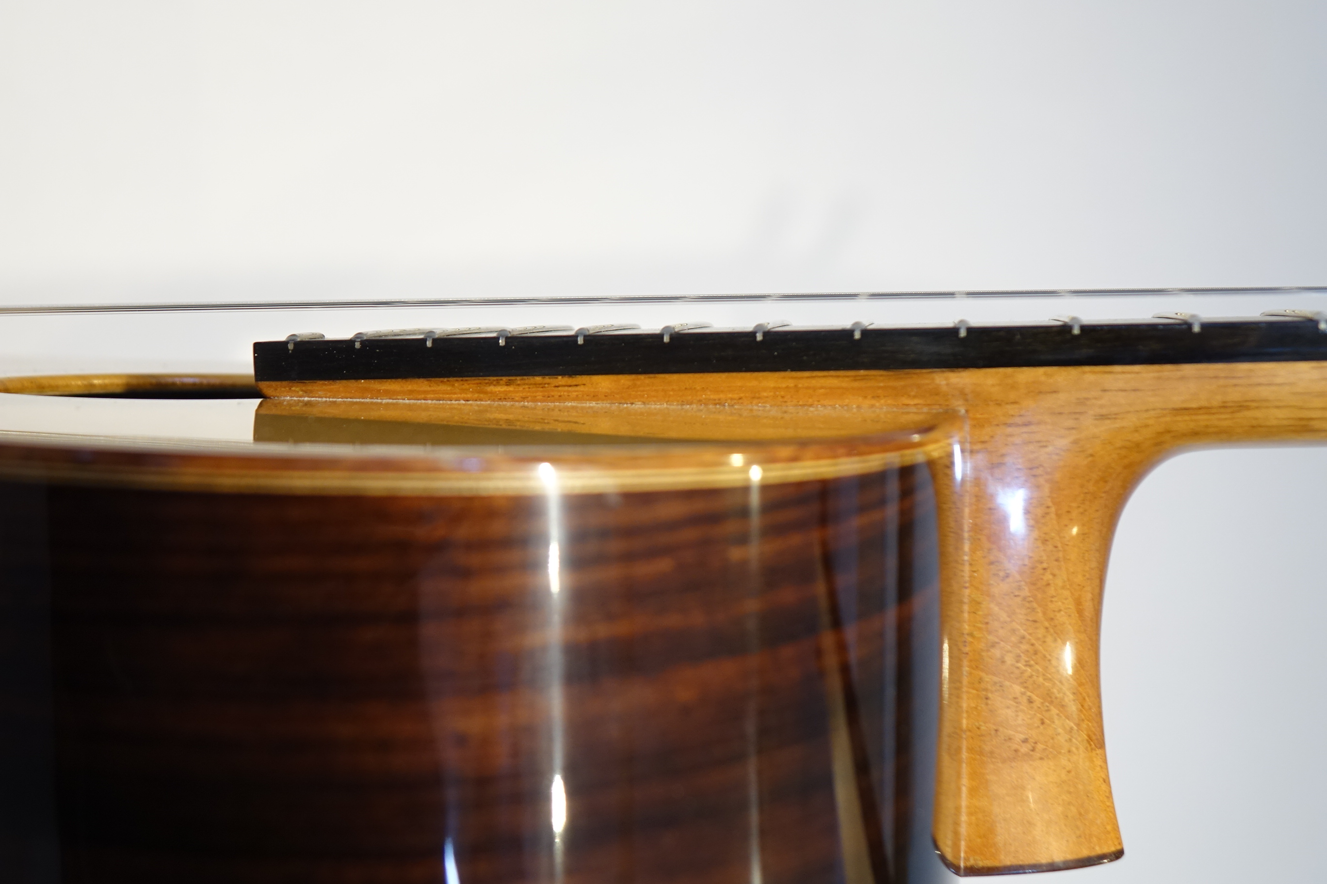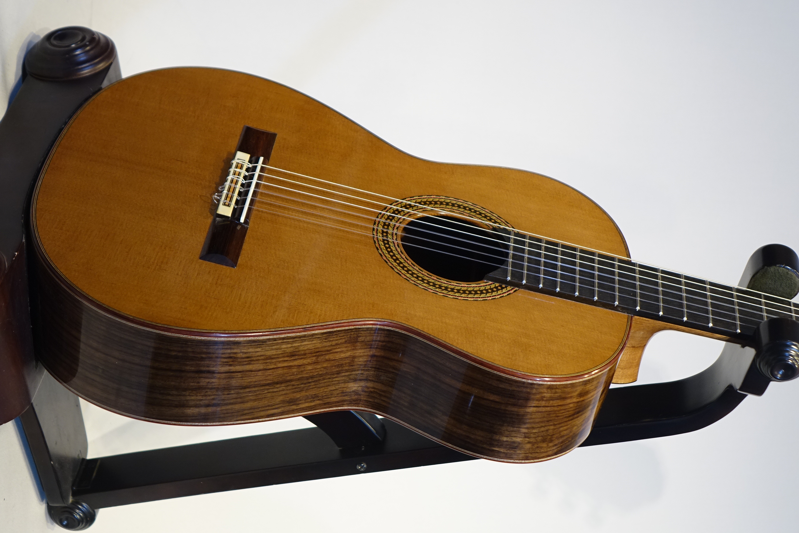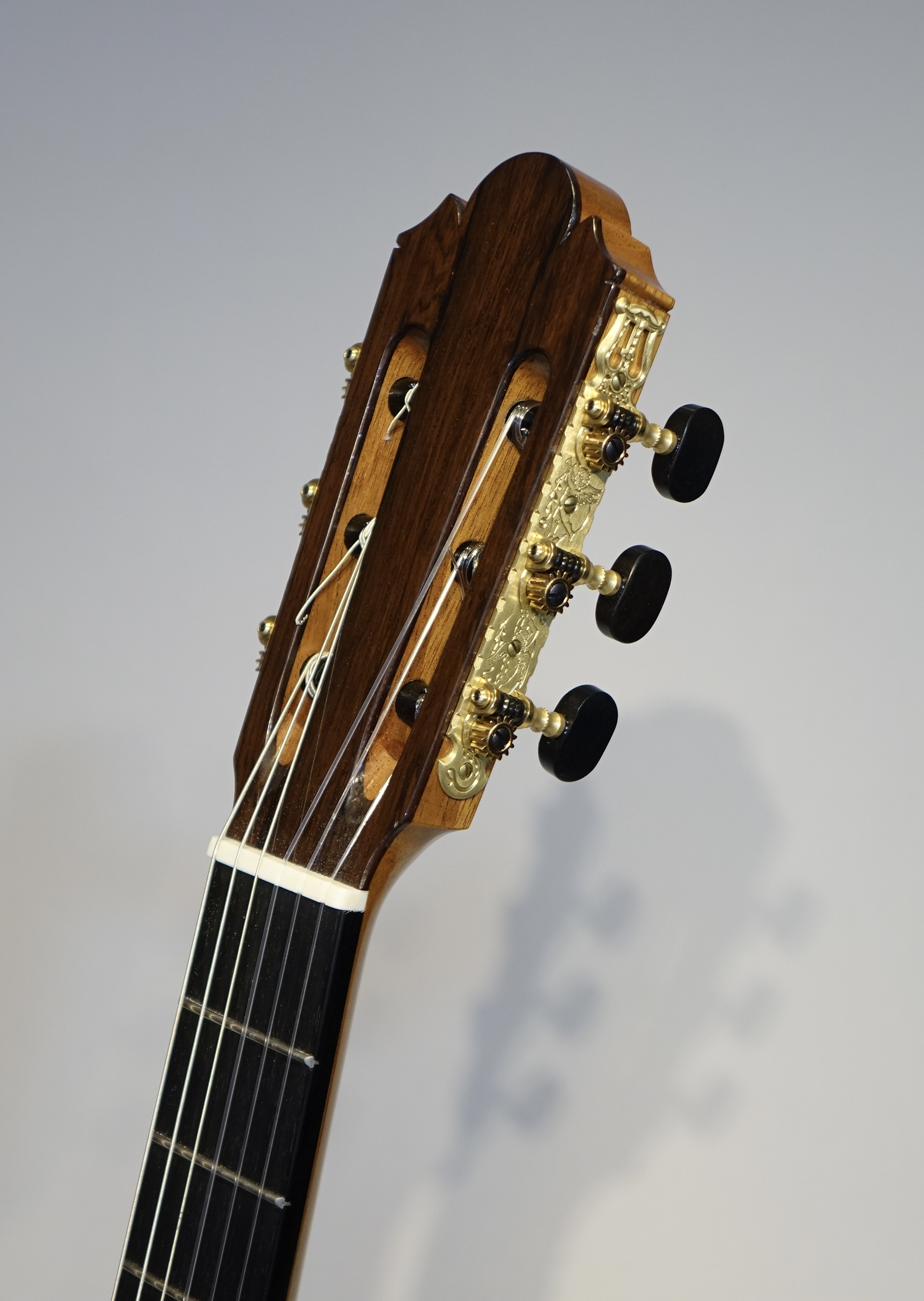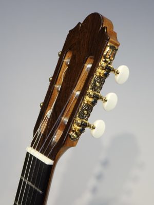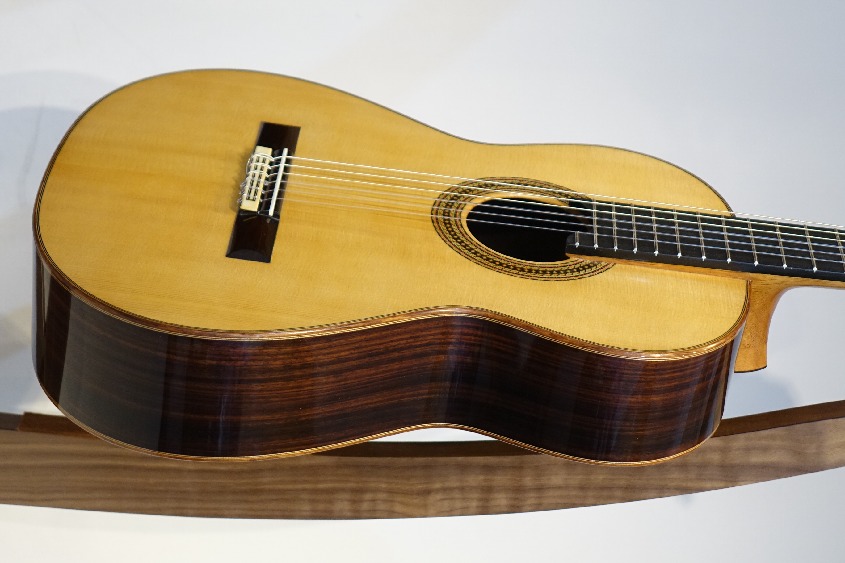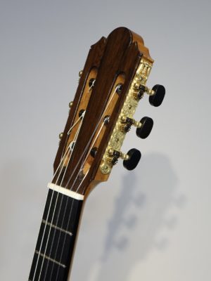 今回製作のこのギターもブーシェの第3期以降採用していたトラベルスバー(下駒の下に横一文字に入るバーで低音側に向かった薄くしている)を氏の得意とするラティスブレーシングをマッチングさせた世界でも初めてとなる構造を採用しています。