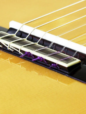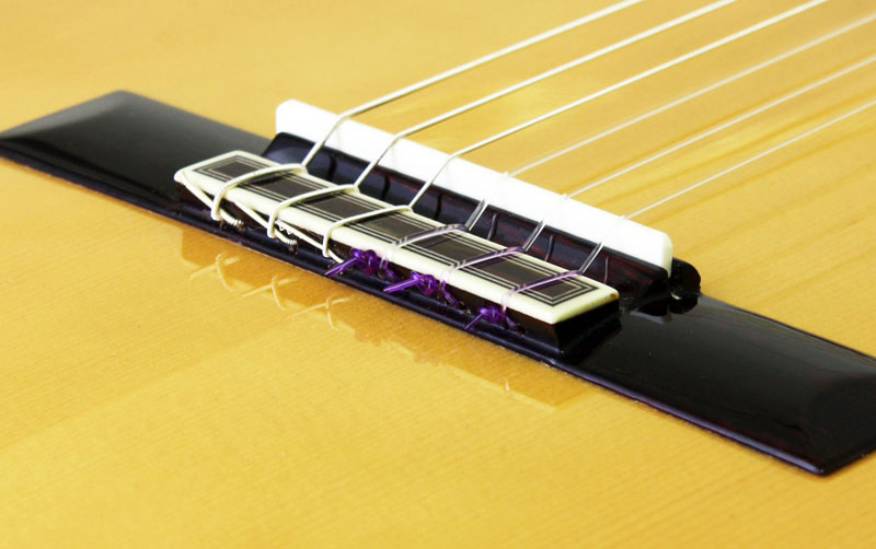 ブリッジは、1弦に対し2つの穴が開いたダブルホールブリッジが採用されています。弦のテンションが稼げるので音量と立ち上がりの良さに貢献します。弦交換も簡単です。 (穴を1つだけ使って従来の結び方をすることも可能です)