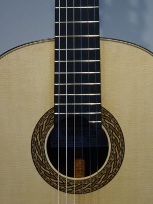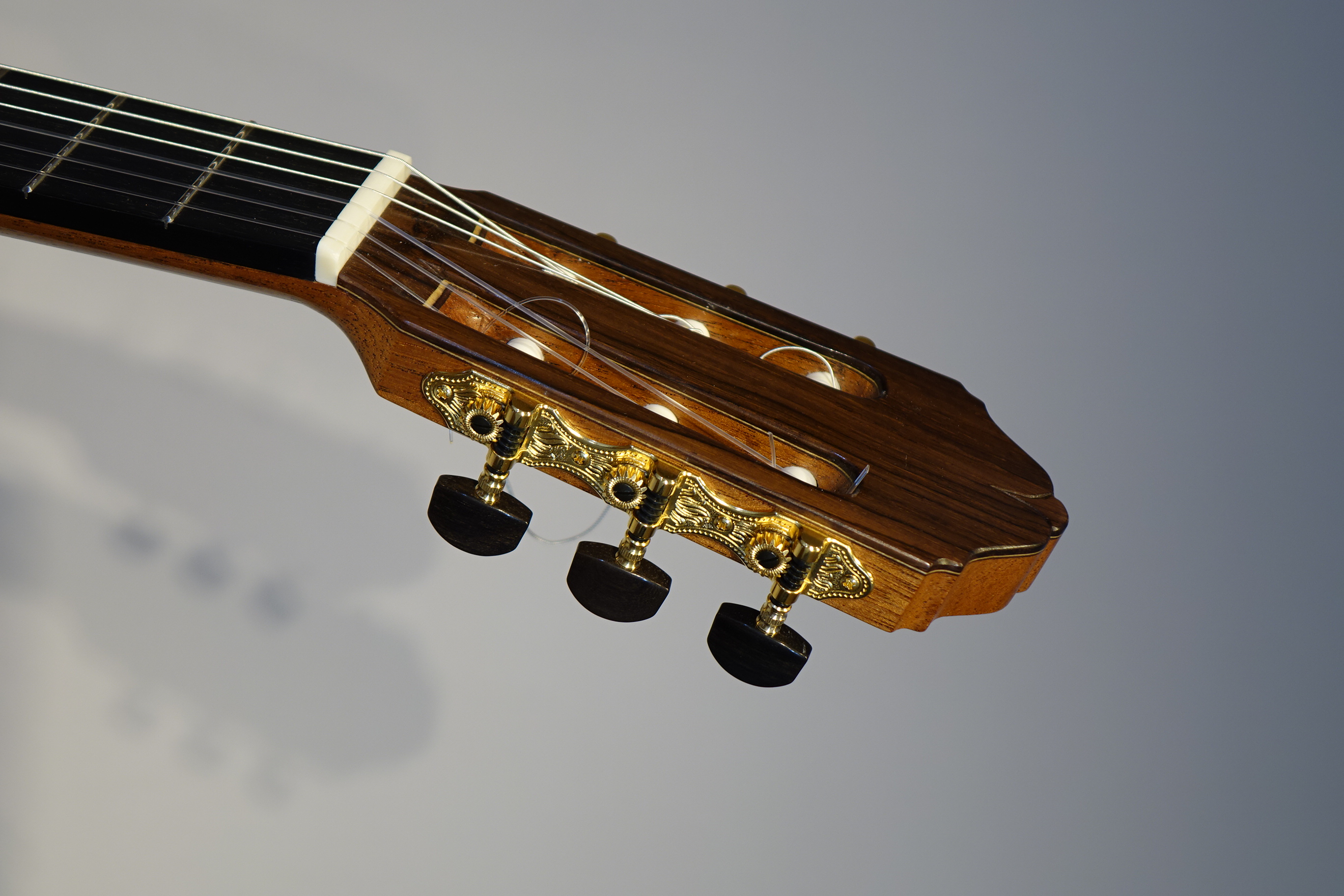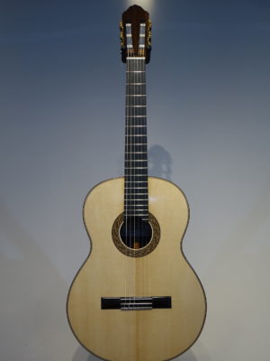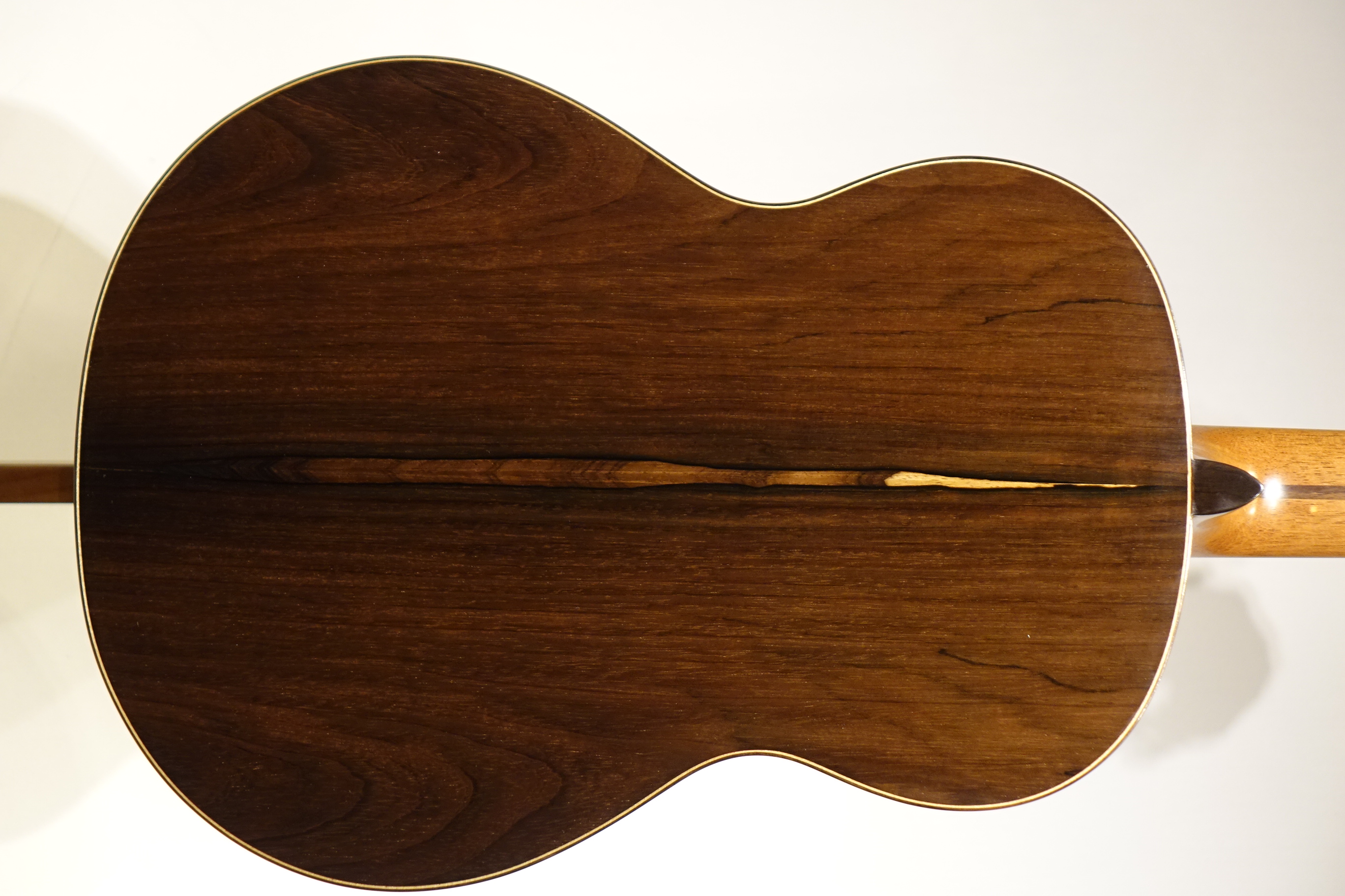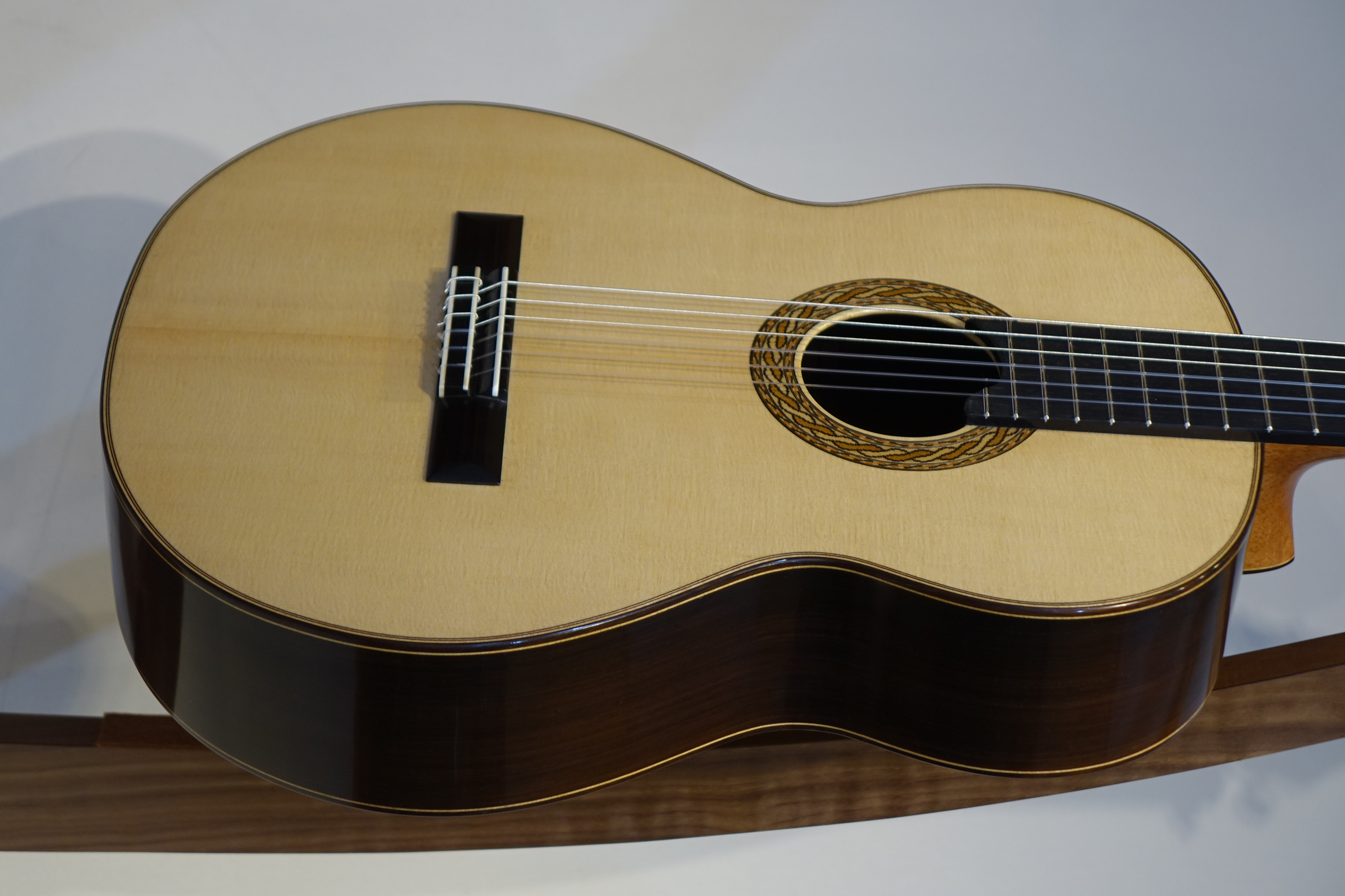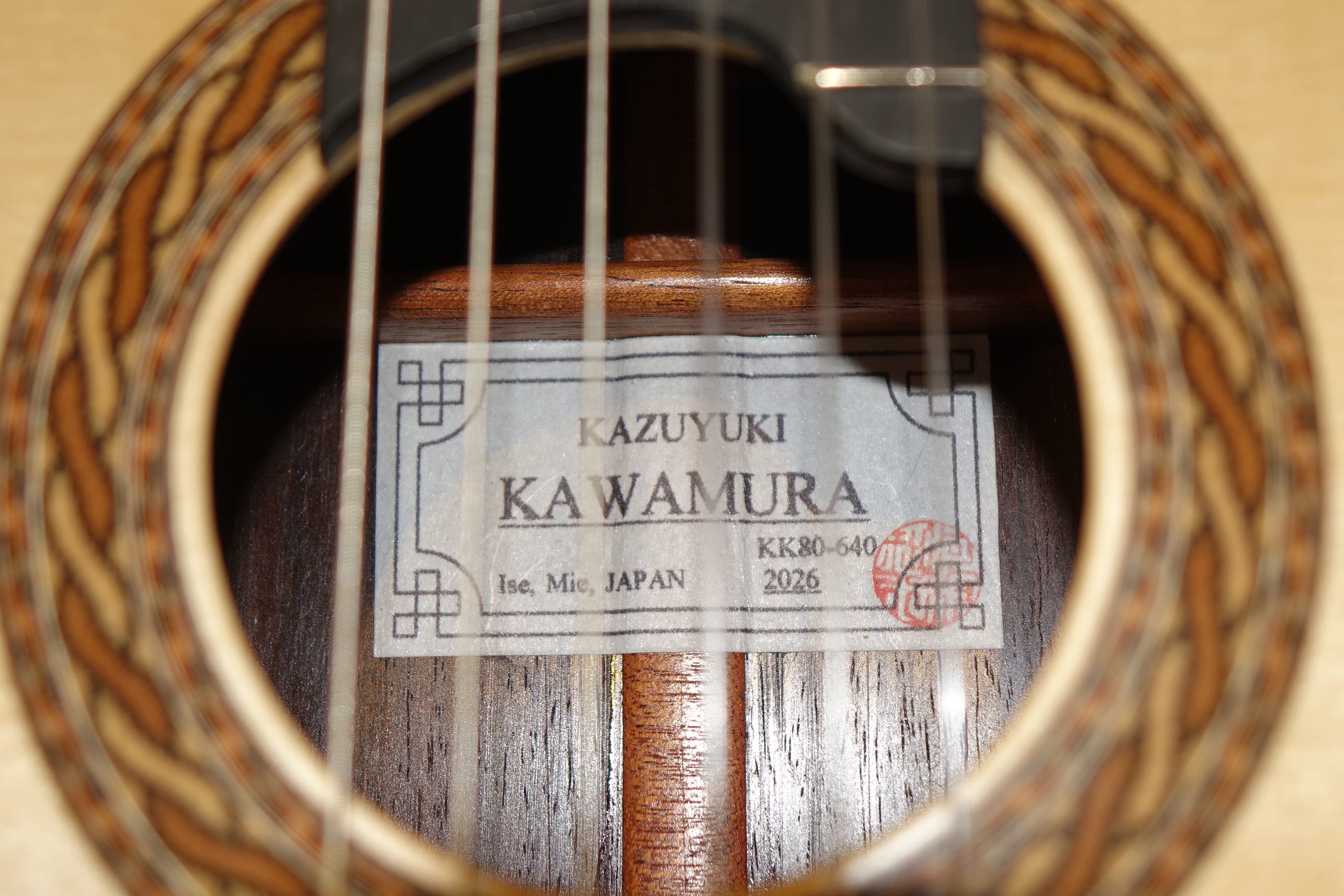 河村和行 KK80の640mmを入荷しました。音に遠達生があり、派手さのない、どっしりと重く、芯のある正統派な音色です。これからもっと、鳴りが良くなっていくだろうと予感させる楽器です。裏・横にはハカランダを使用。裏板は見た目にも非常に美しいです。このご時世、ハカランダを使用した楽器で定価80万円は、信じられないほどお値打ちです。ダブルホール。糸巻はシャラーです。