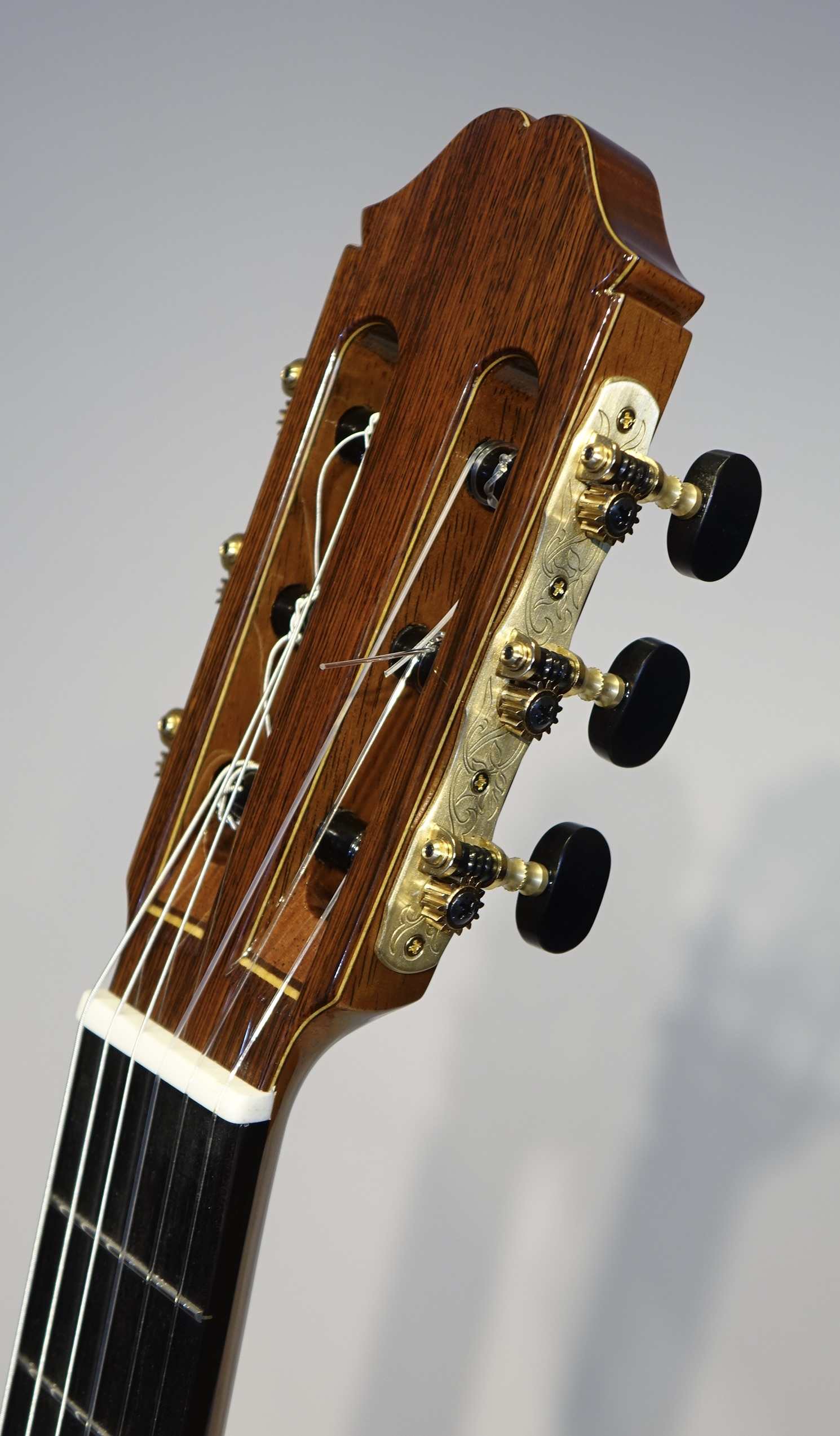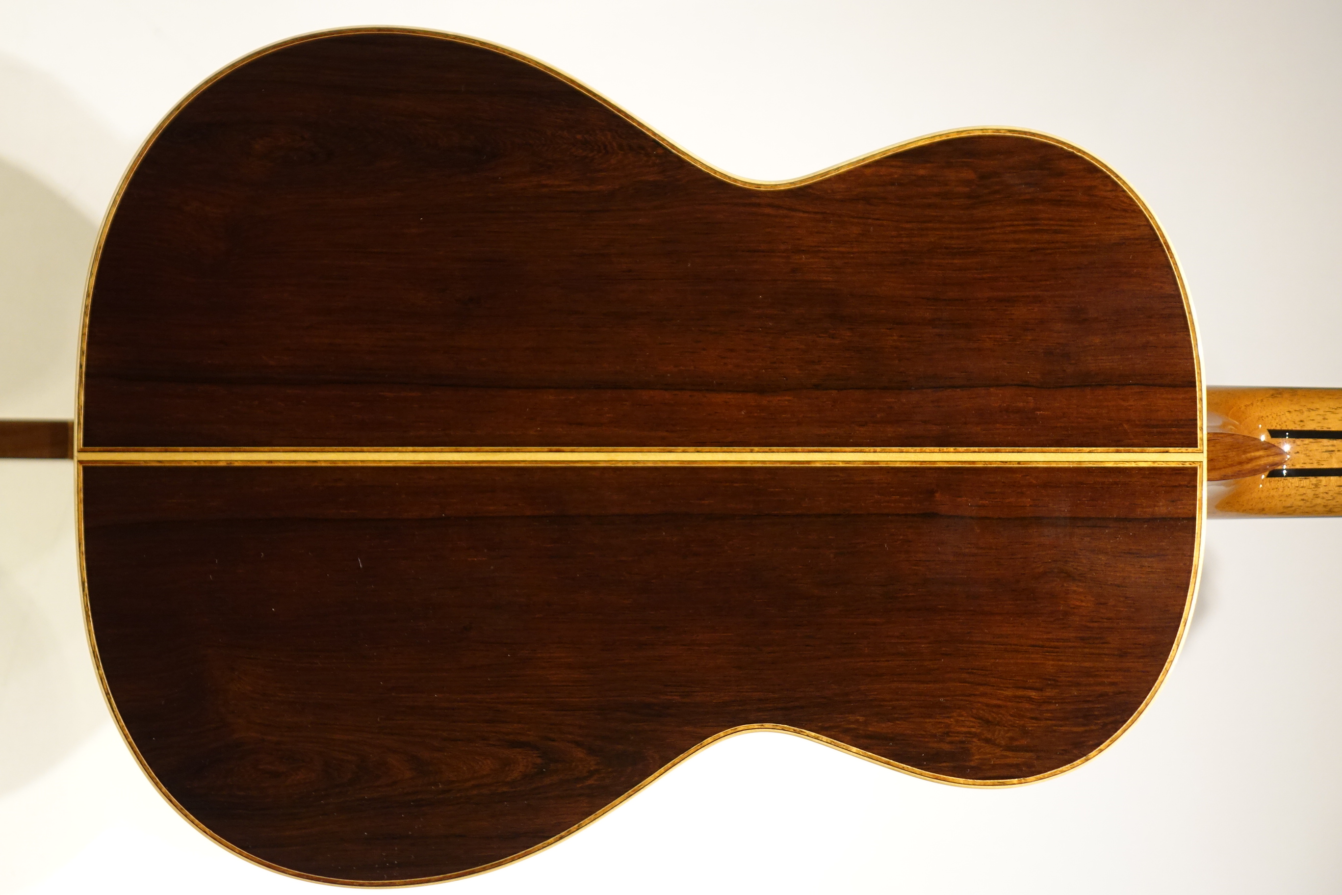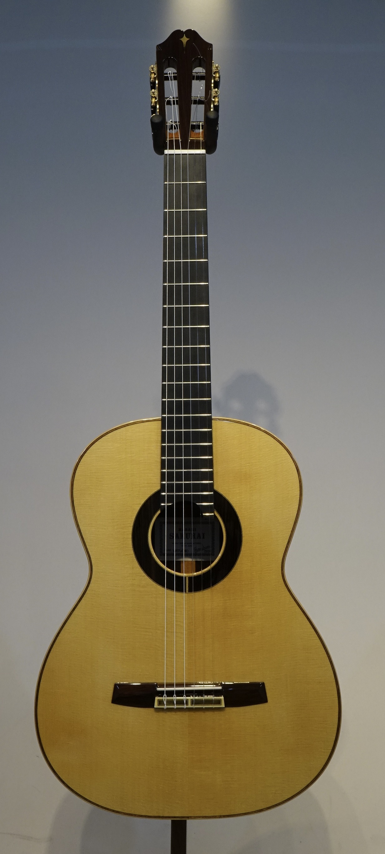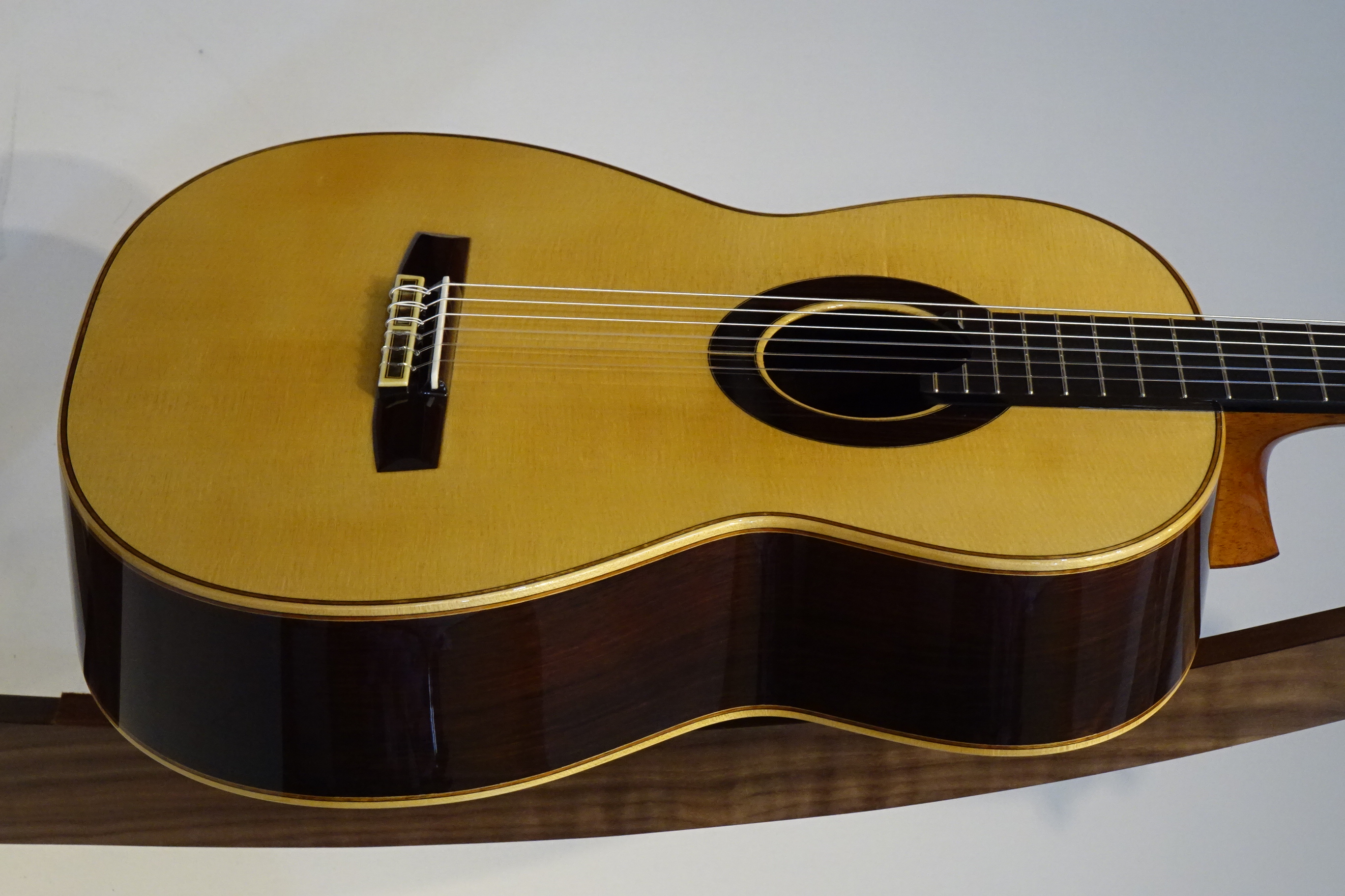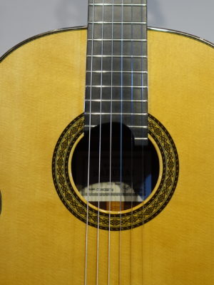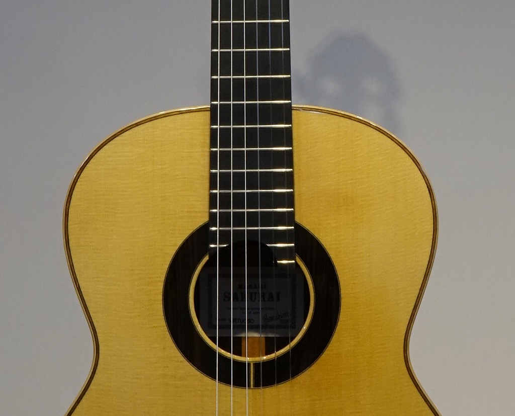 今回の材は表・裏板ともに素晴らしい品質のもので、芯のある締まった音ながら音量もあり、マエストロらしい深みのある音でサスティーンが長く、低音から高音にかけてのバランスも抜群に良いので気持ちよく演奏できます。 RF構造(レイズドフィンガーボード)のためハイポジションでもストレスの無い演奏性を実現。力木研究により、全てのポジションにおいて均一な鳴りと豊かな音量を実現しています。 弦長640㎜、ナット幅51㎜、7フレットにポジションマーク付、20フレット付の特注品です。