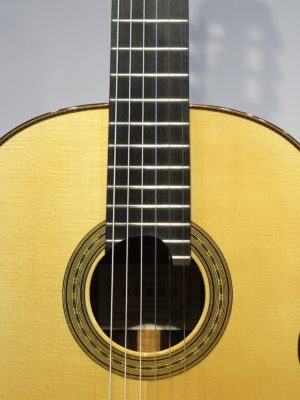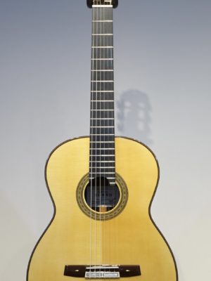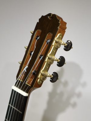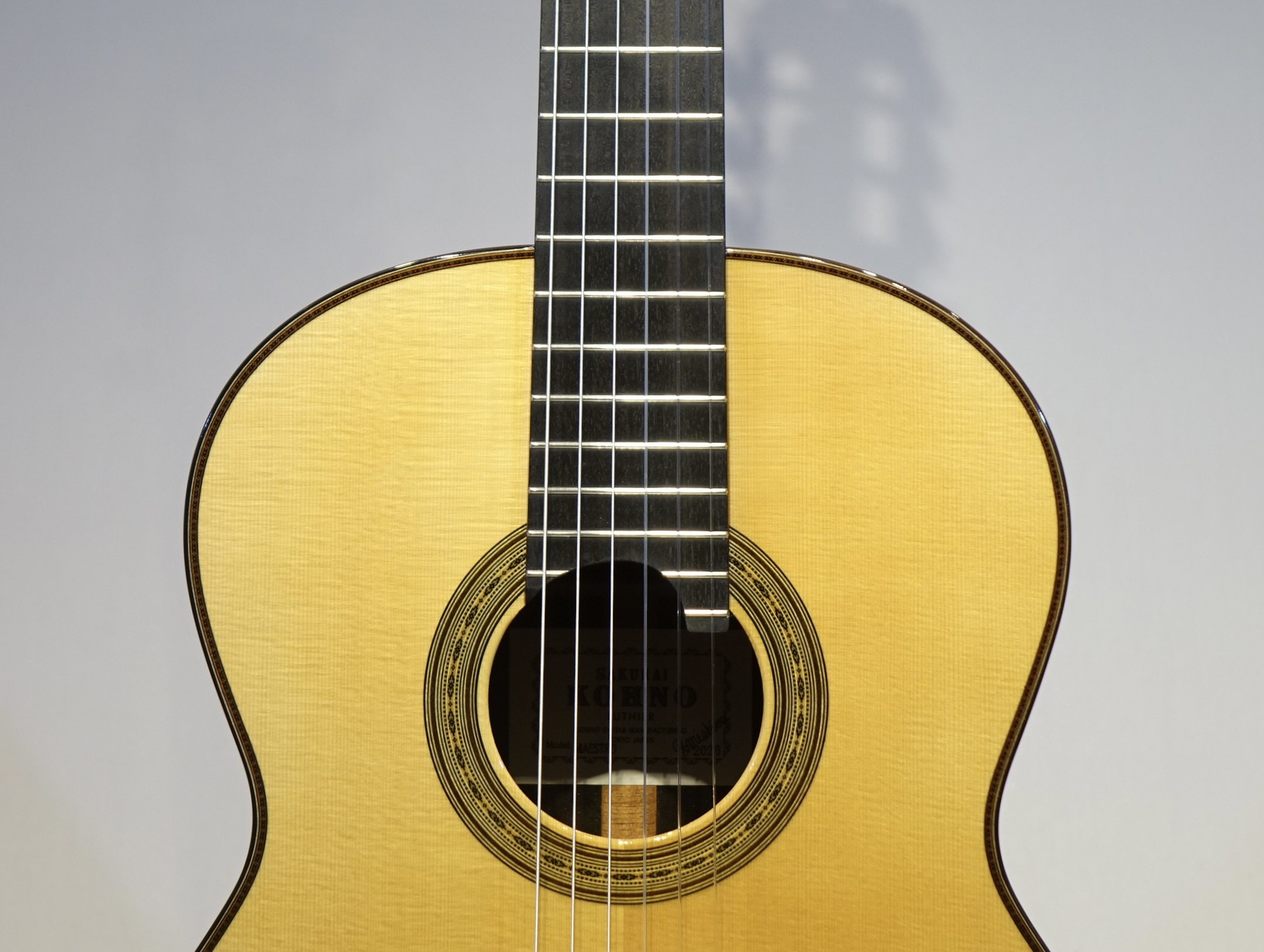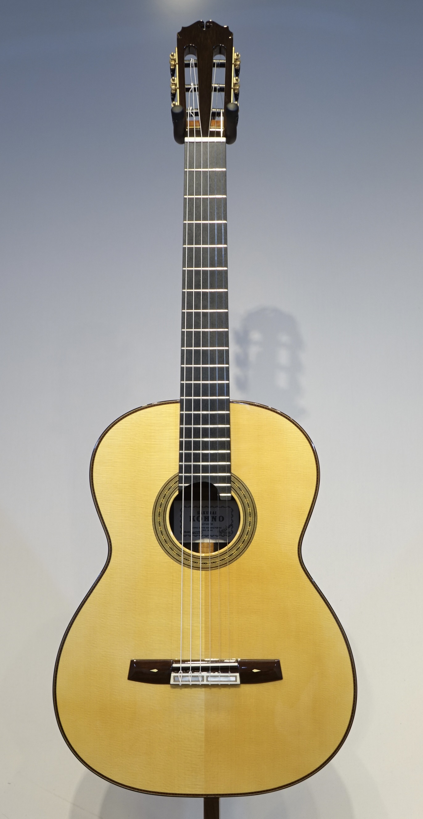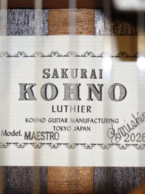 日本のクラシックギター製作家を代表していた河野 賢氏。この匠の技術を継承して桜井正毅氏の設計のもと桜井正毅氏が製作している桜井・河野ギターの最高モデル。ドシッとした音で低音から高音までバランスよくふくよかに且つ分離よく鳴ってくれます。この楽器は弦長635mm、ナット幅51㎜の特注品なのでとても弾き易いです。7フレットにポジションマーク、20Fも付いています。生涯の1本となる楽器です。この楽器はミューズ特注品としての販売となります。
