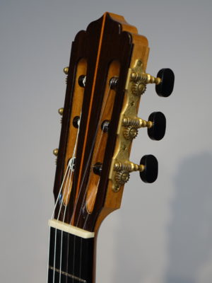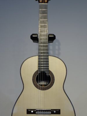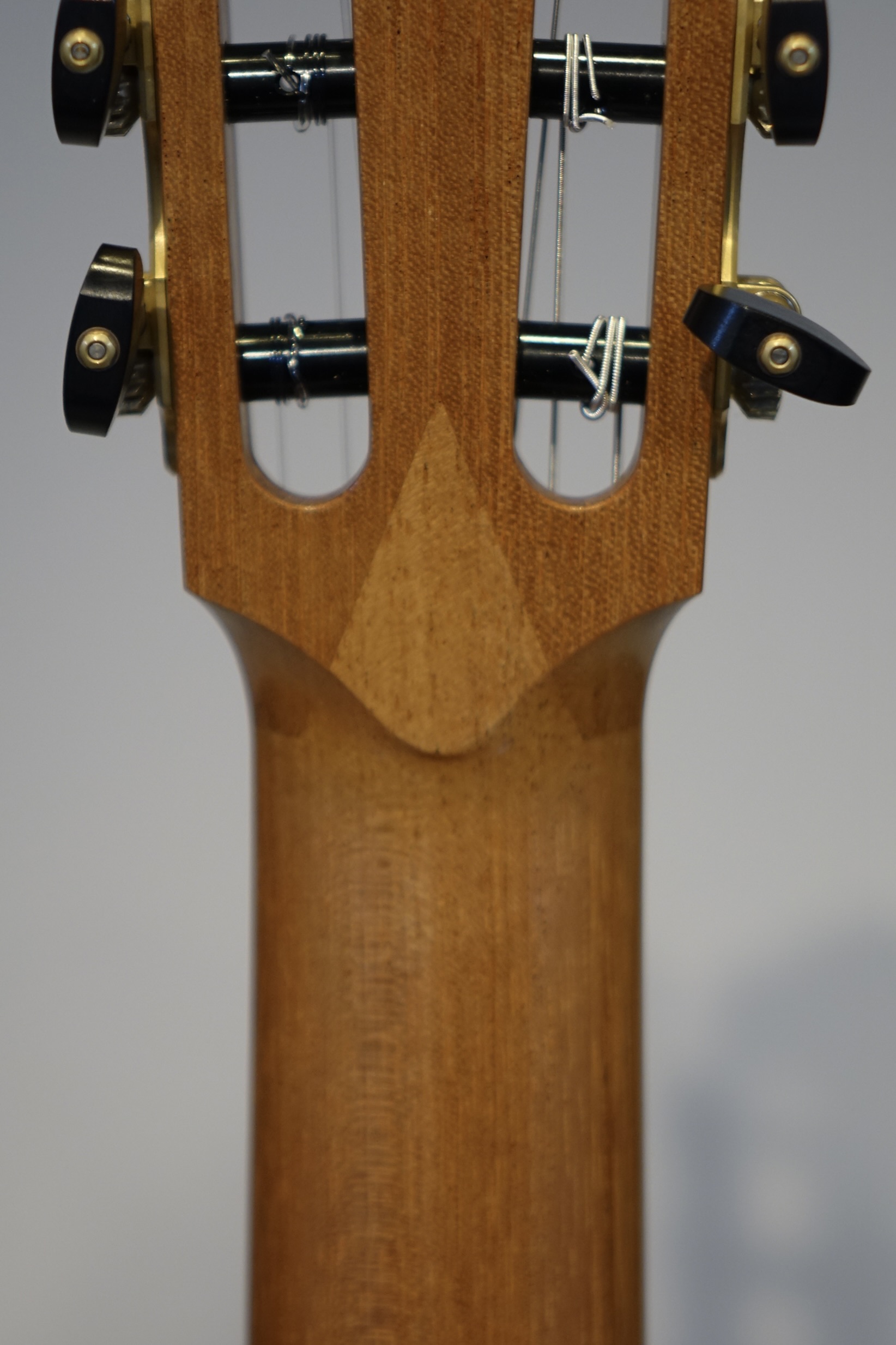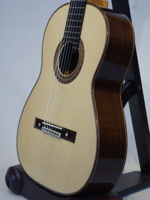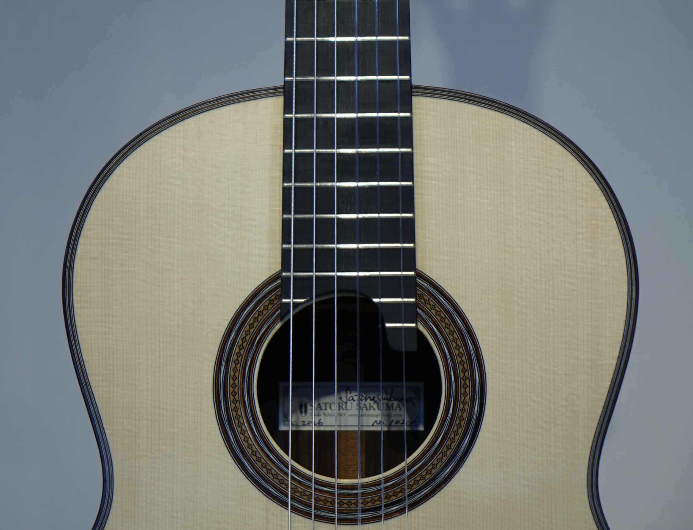佐久間悟ギターが入荷しました。弦長は640mmのロマニリョスモデルです。弾いた瞬間に感じる「何とも素晴らしい音」はだれもが感じると思います。ミューズで行われた弾き比べコンサートでも、みなさんがこのギターに注目していました。たくさんの銘器と言われるギターの中でも、一目を置かれる存在感があります。特に低音の鳴りはすばらしく、バランスも良く、音の分離も良いです。一度ご試奏ください!