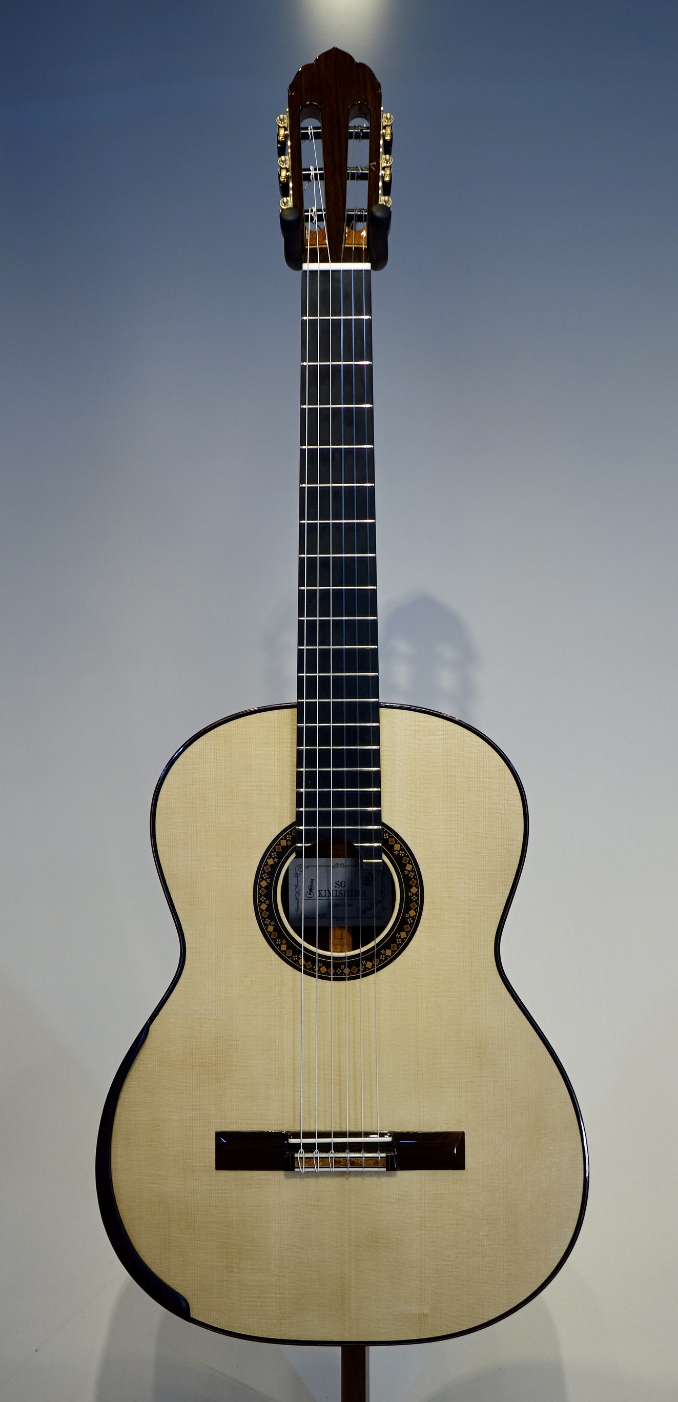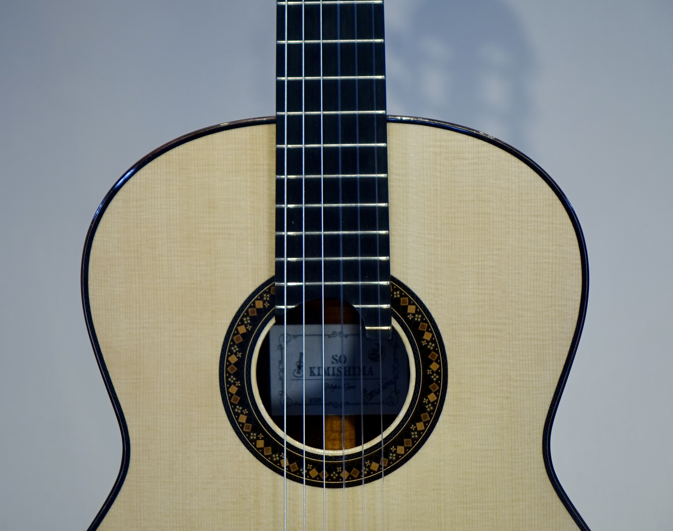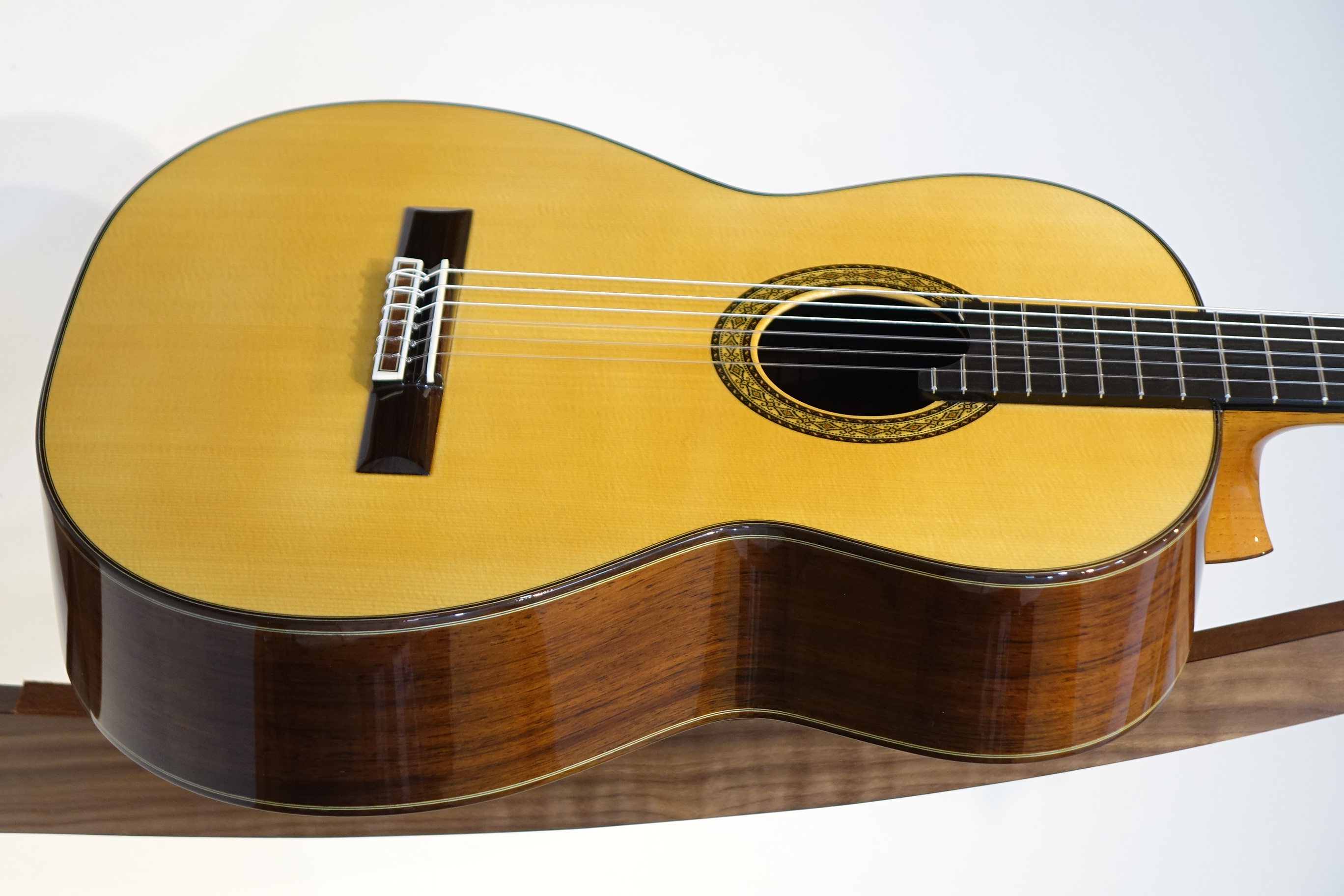 今回の材は表・裏板ともに素晴らしい品質のもので、芯のある締まった音ながら音量もあり、マエストロらしい深みのある音でサスティーンが長く、低音から高音にかけてのバランスも抜群に良いので気持ちよく演奏できます。 RF構造(レイズドフィンガーボード)のためハイポジションでもストレスの無い演奏性を実現。力木研究により、全てのポジションにおいて均一な鳴りと豊かな音量を実現しています。 弦長640㎜、ナット幅51㎜、7フレットにポジションマーク付、20フレット付の特注品です。
