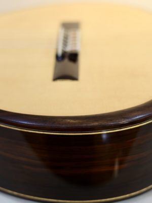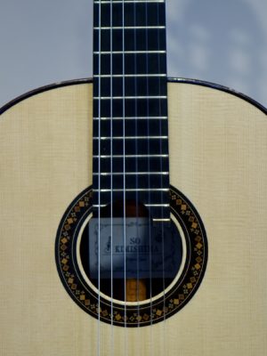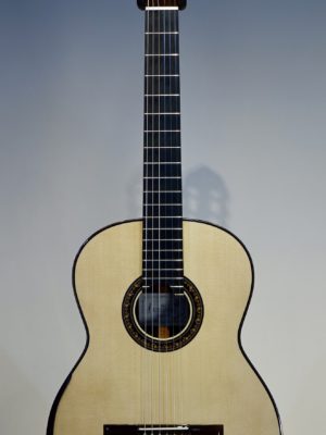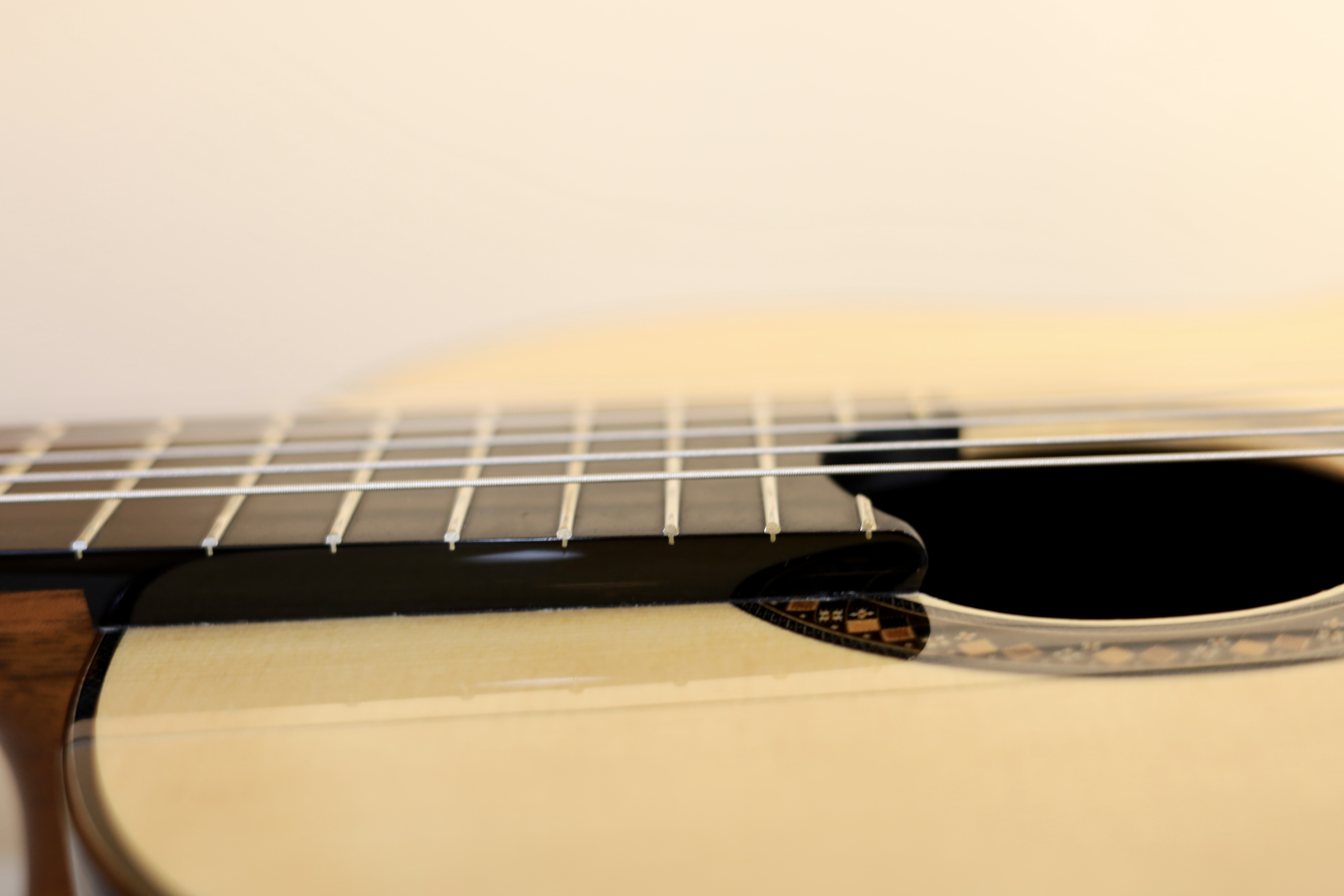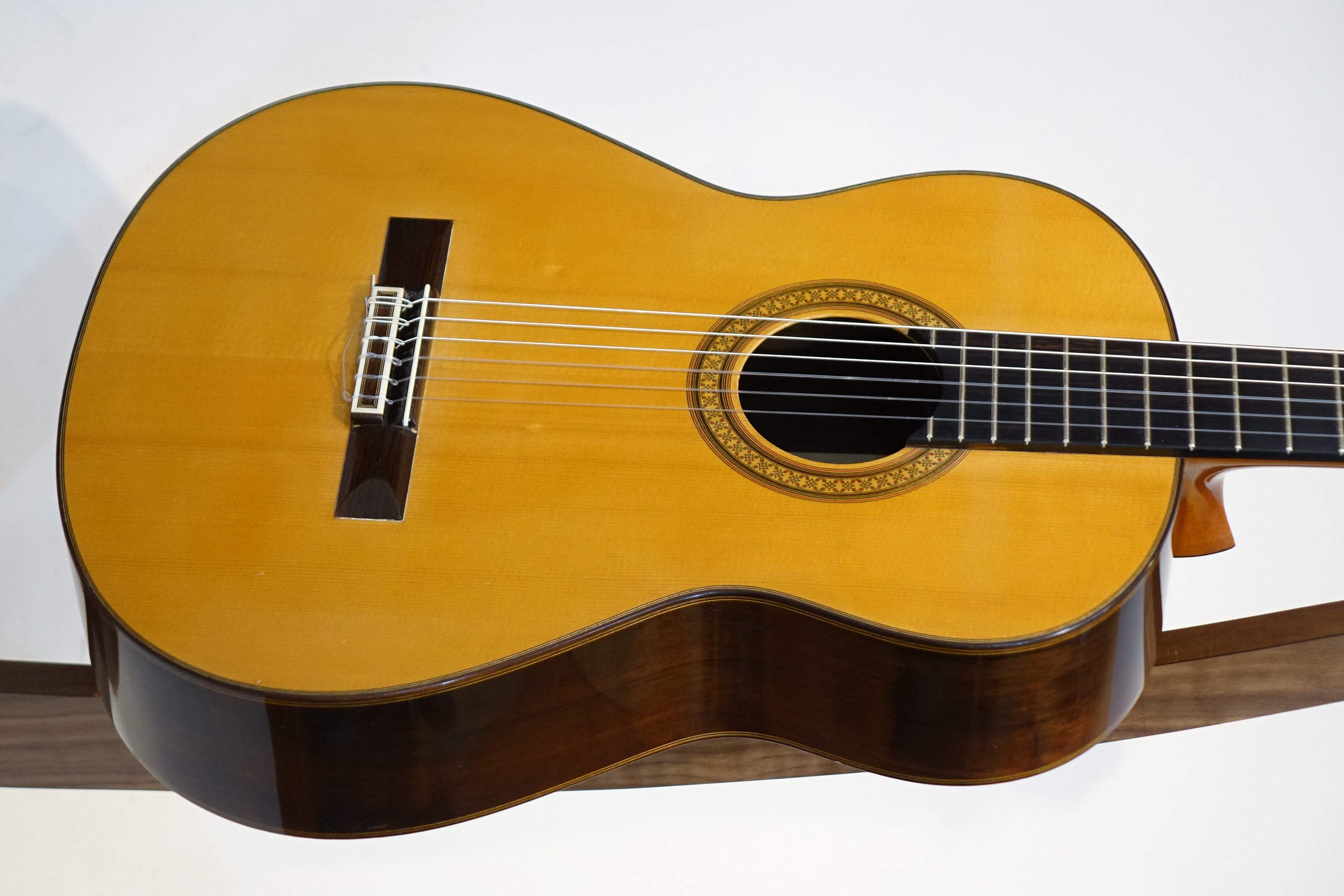今回の材は表・裏板ともに素晴らしい品質のもので、芯のある締まった音ながら音量もあり、マエストロらしい深みのある音でサスティーンが長く、低音から高音にかけてのバランスも抜群に良いので気持ちよく演奏できます。 RF構造(レイズドフィンガーボード)のためハイポジションでもストレスの無い演奏性を実現。力木研究により、全てのポジションにおいて均一な鳴りと豊かな音量を実現しています。 弦長640㎜、ナット幅51㎜、7フレットにポジションマーク付、20フレット付の特注品です。