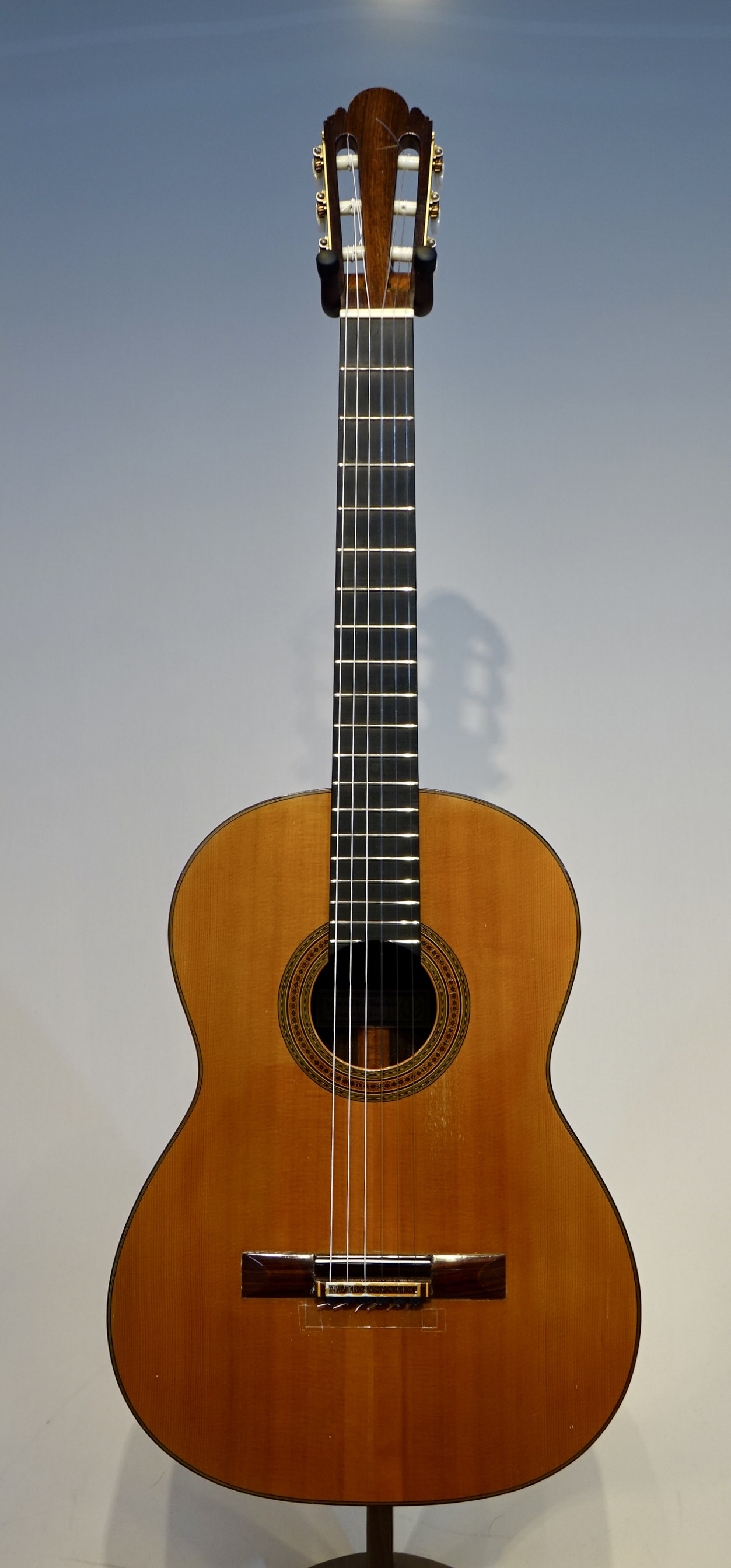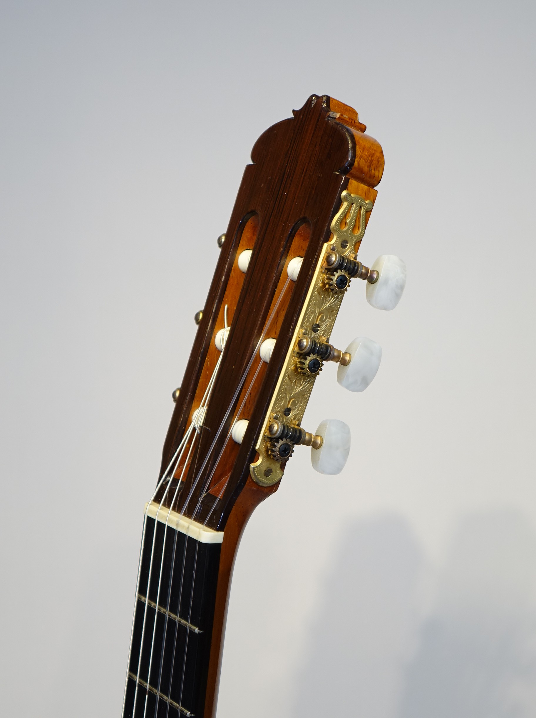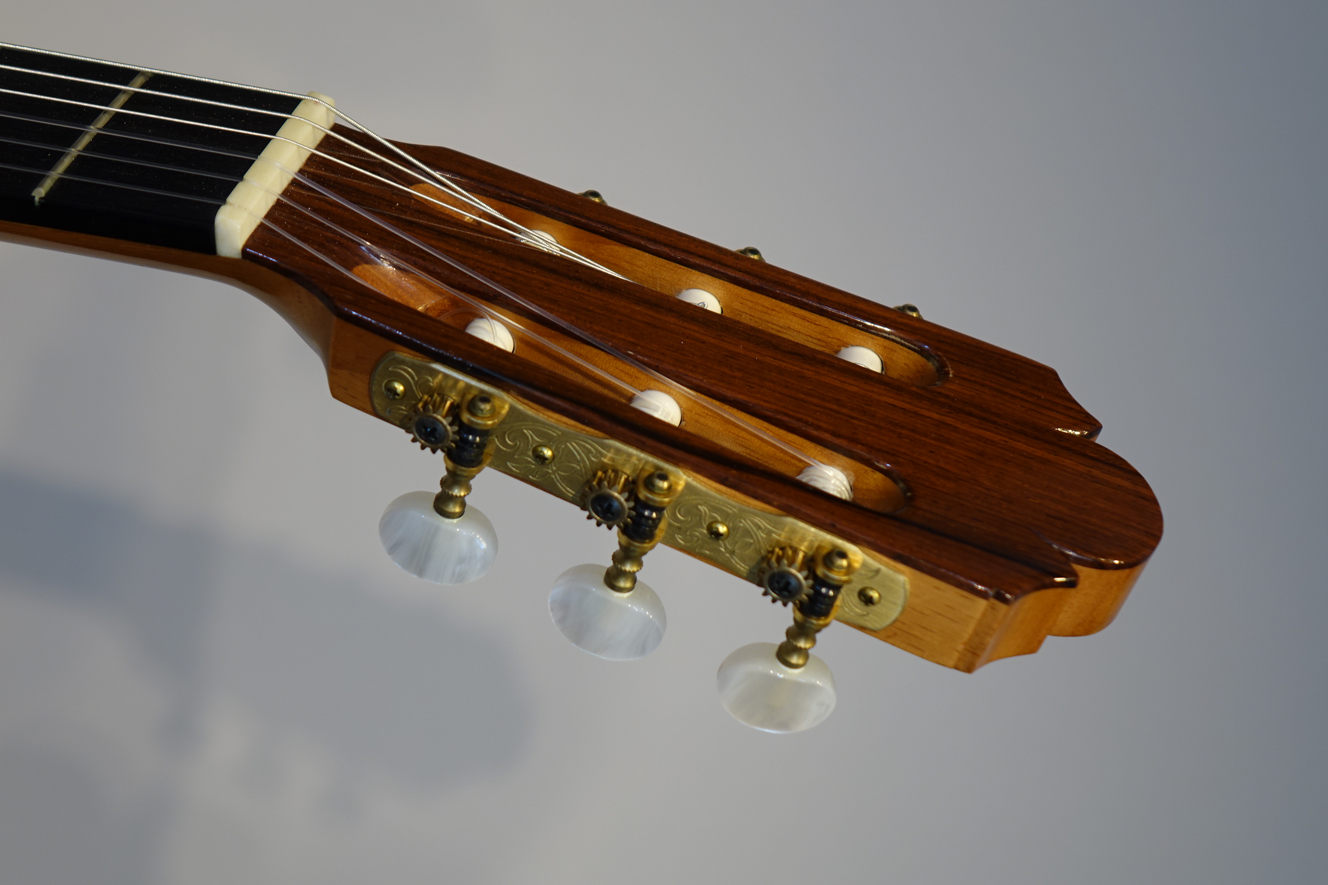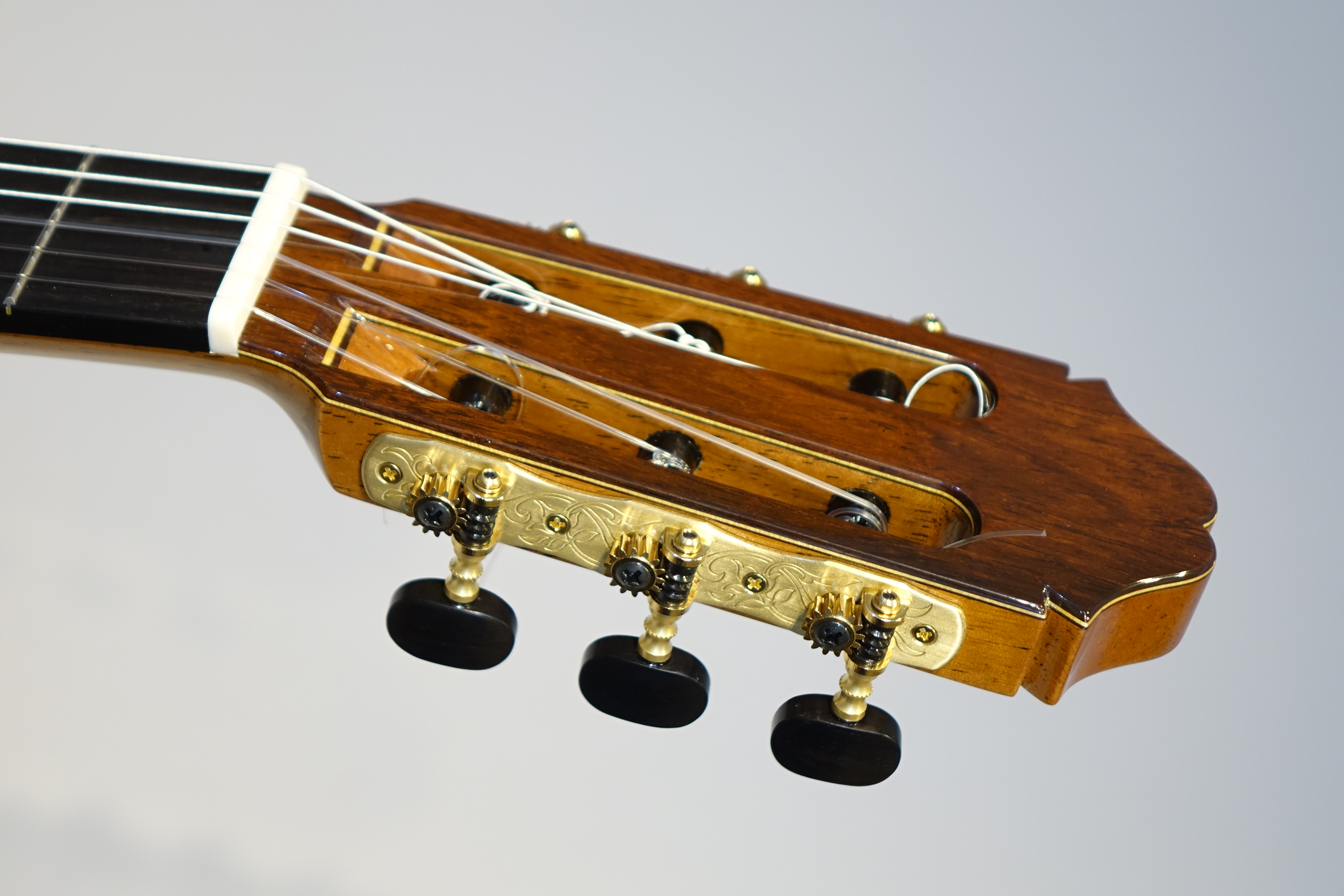 1977年にブーシェに出会い、その後ブーシェモデルの製作を始めたと言われていますので、このギターはブーシェのに強く影響を受ける前の楽器だと思われます。低音は粘り、伸びがあり、貫禄ある音色ですが、高音はカラっと気持ちよく鳴ってくれます。ペグはフステロです。