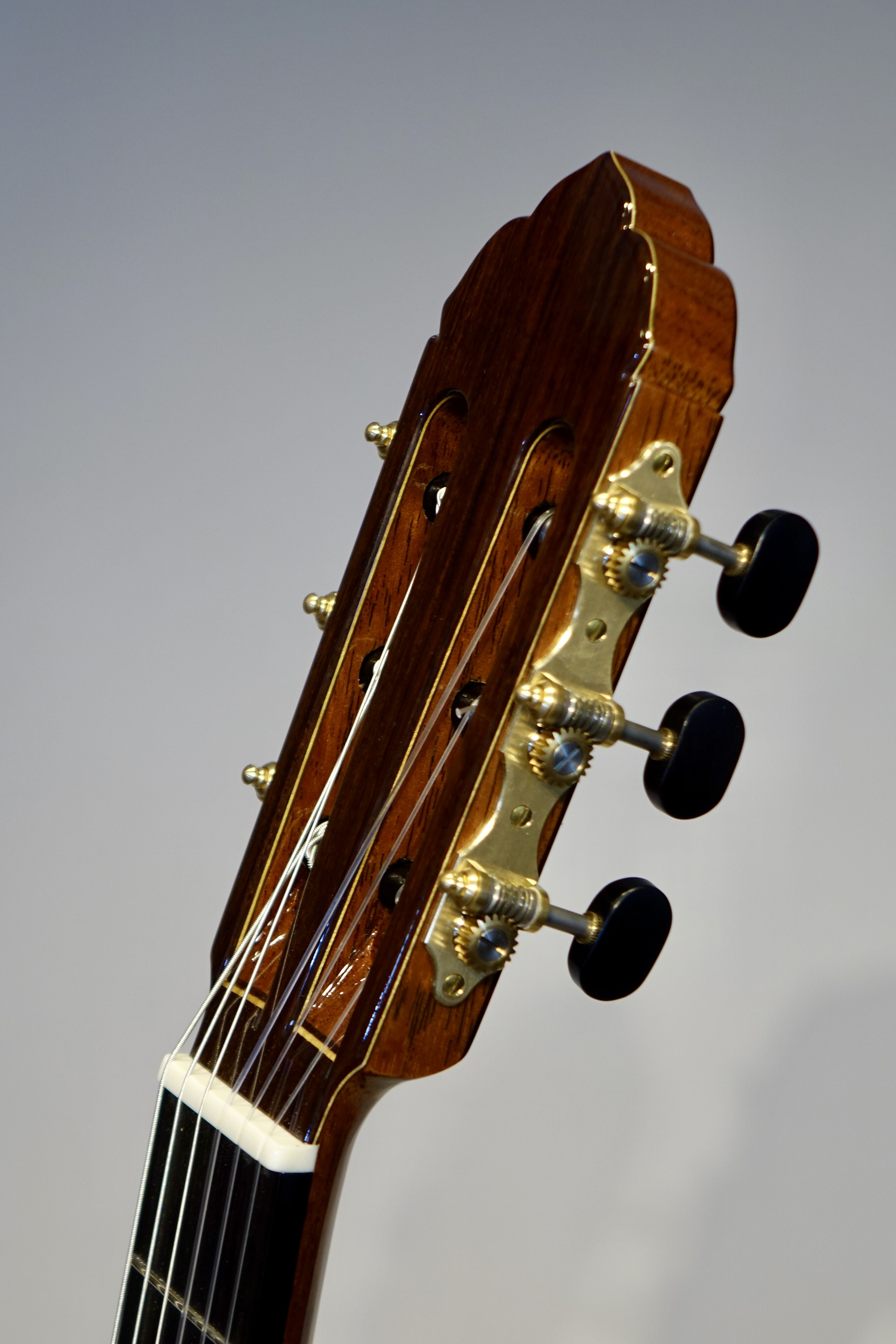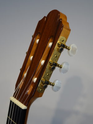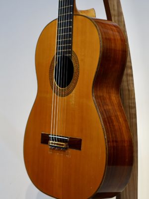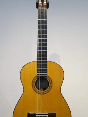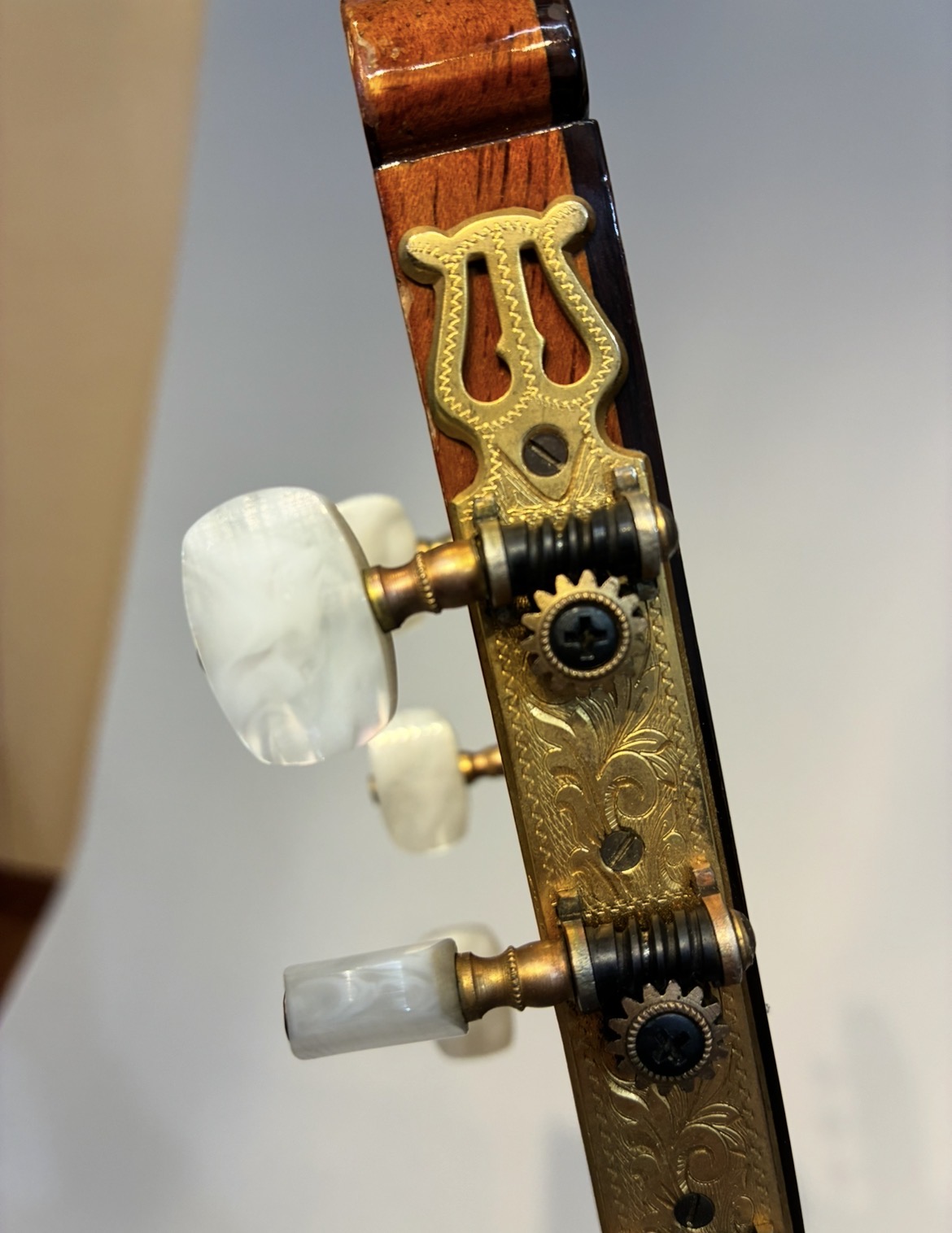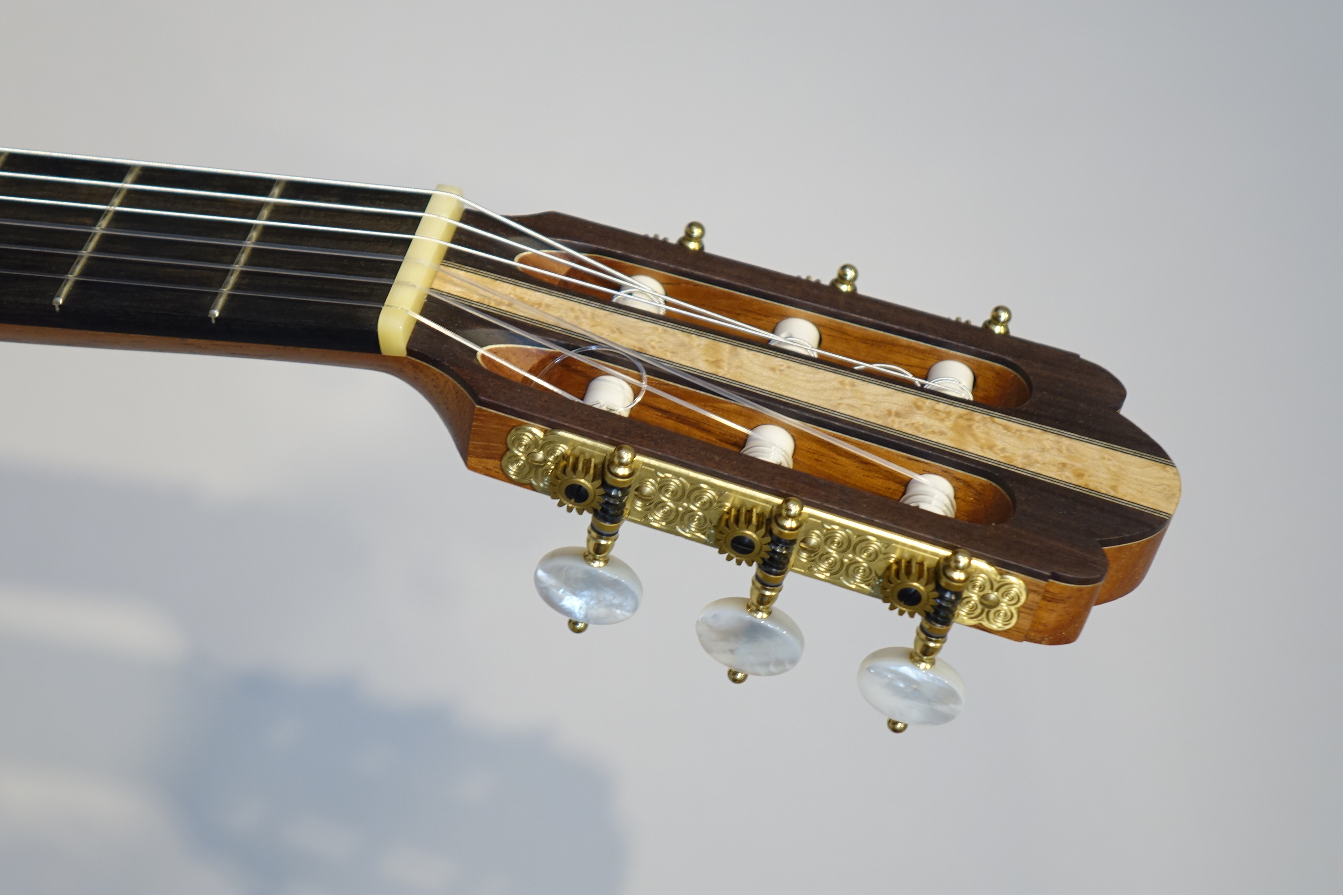 1977年にブーシェに出会い、その後ブーシェモデルの製作を始めたと言われていますので、このギターはブーシェのに強く影響を受ける前の楽器だと思われます。低音は粘り、伸びがあり、貫禄ある音色ですが、高音はカラっと気持ちよく鳴ってくれます。ペグはフステロです。