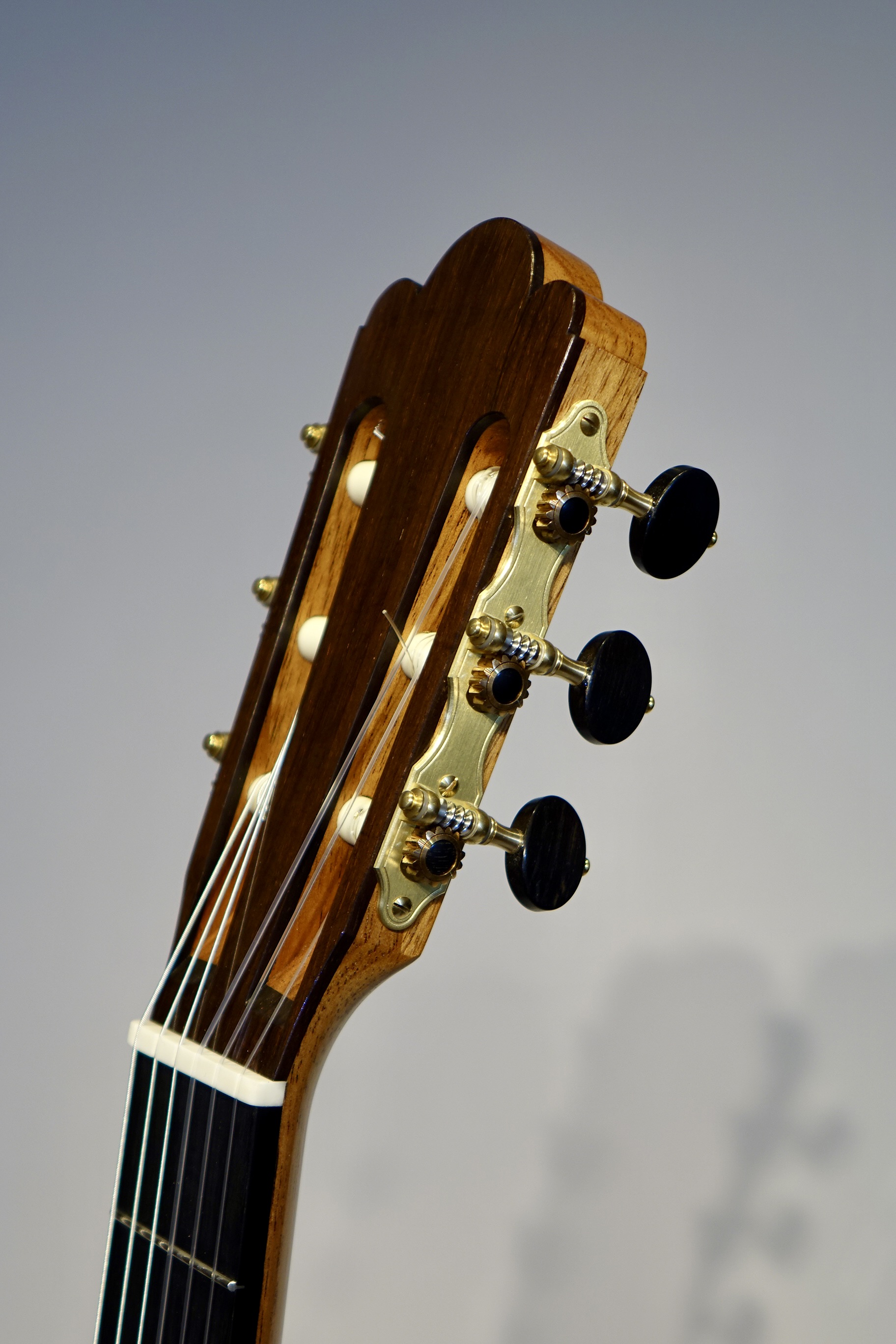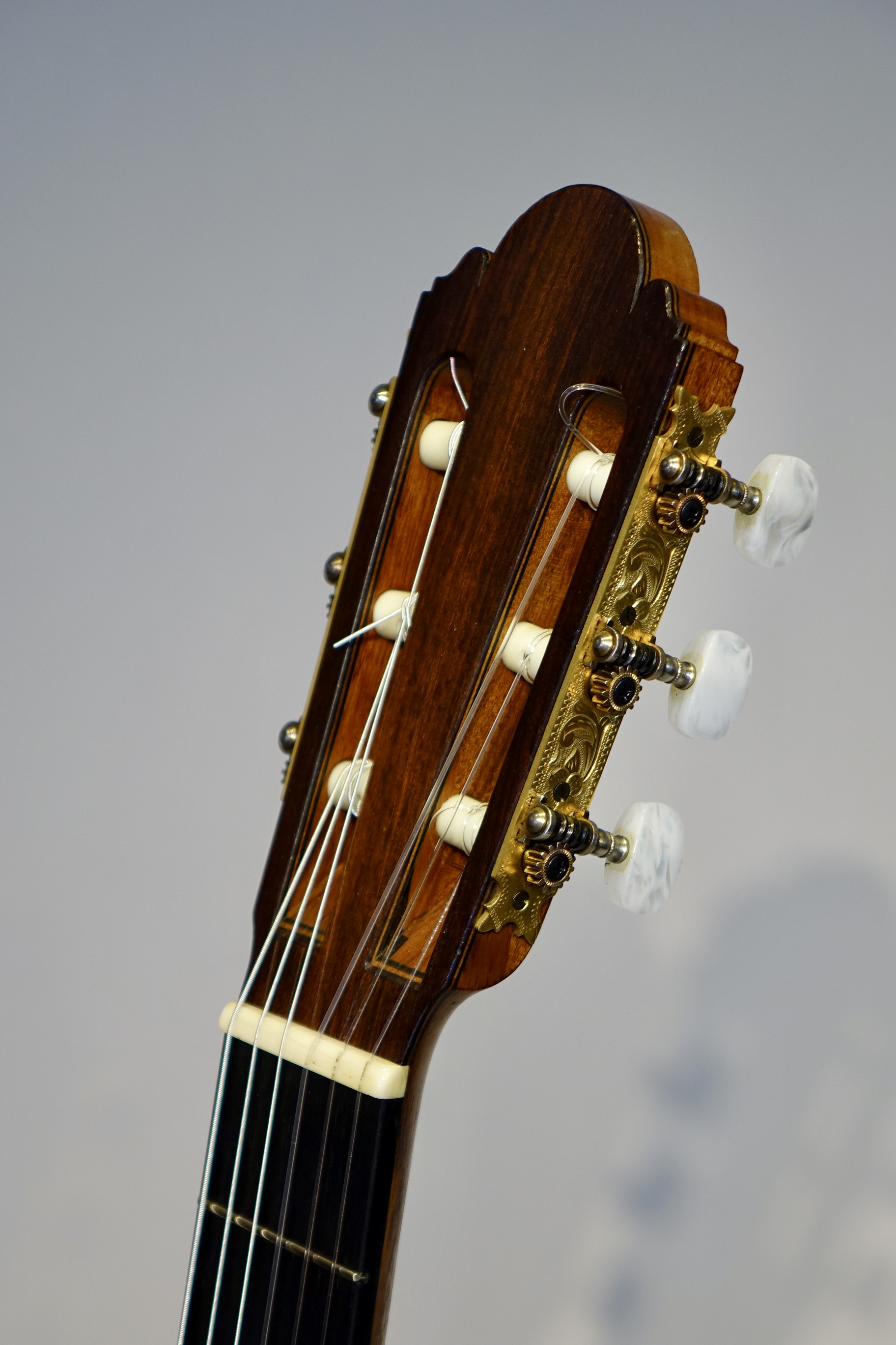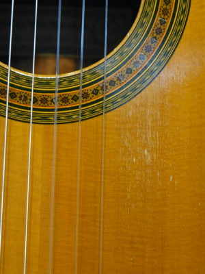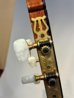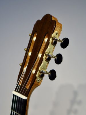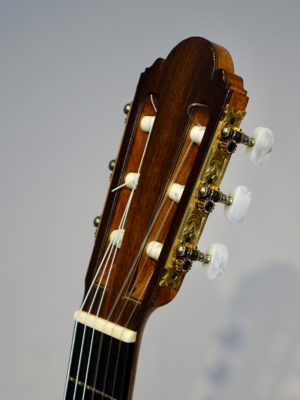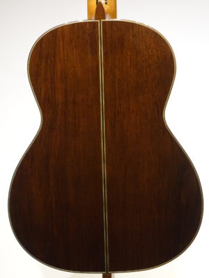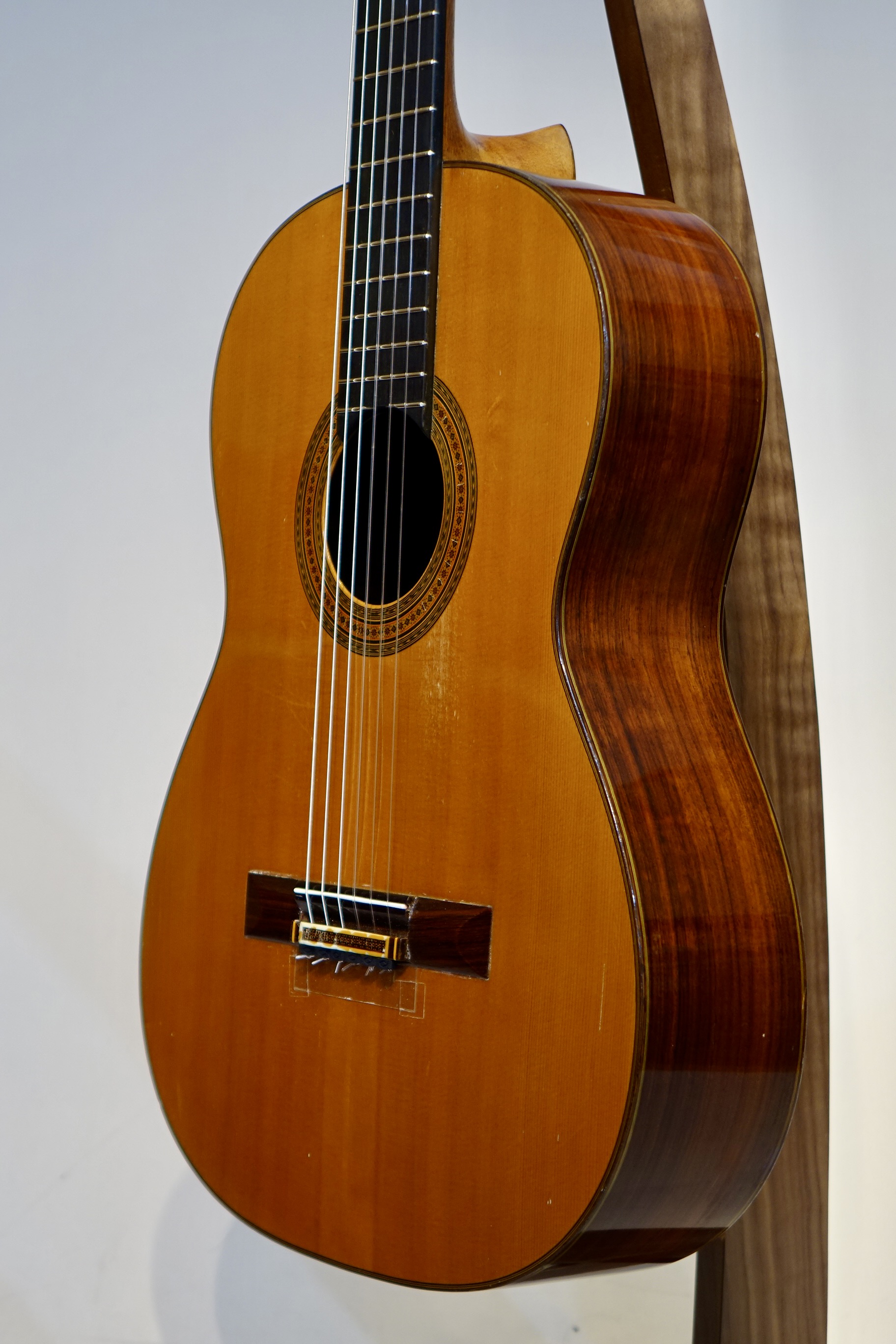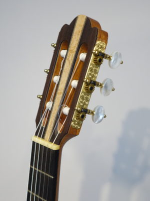 1977年にブーシェに出会い、その後ブーシェモデルの製作を始めたと言われていますので、このギターはブーシェのに強く影響を受ける前の楽器だと思われます。低音は粘り、伸びがあり、貫禄ある音色ですが、高音はカラっと気持ちよく鳴ってくれます。ペグはフステロです。