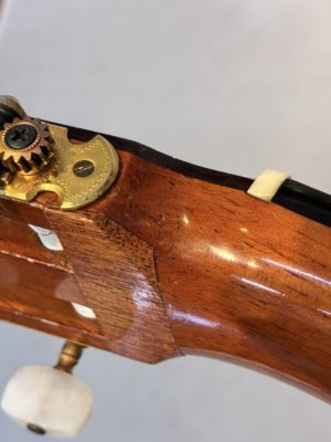 表板は全面に交差杢の入った良い材が使われており、裏板とヘッドのセンター、及びボディーバインディングにバーズアイメイプルをあしらう事で楽器に気品と美しさが漂っています。糸巻きには美しいロジャースが装着されています。洗練の極みと言っても良いでしょう。