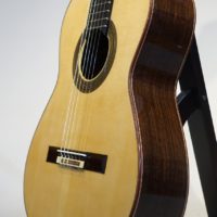 川田一行の630mmが入荷しました。ラティスブレージングを採用しておりとても豊かに響きます。表板の米杉は45年以上前の物を田村時代の弟弟子から近年譲り受けた物だそうです。ロゼッタは田村満氏と同様のデザインになっていて、まさにオマージュ作品にふさわしい一本です。