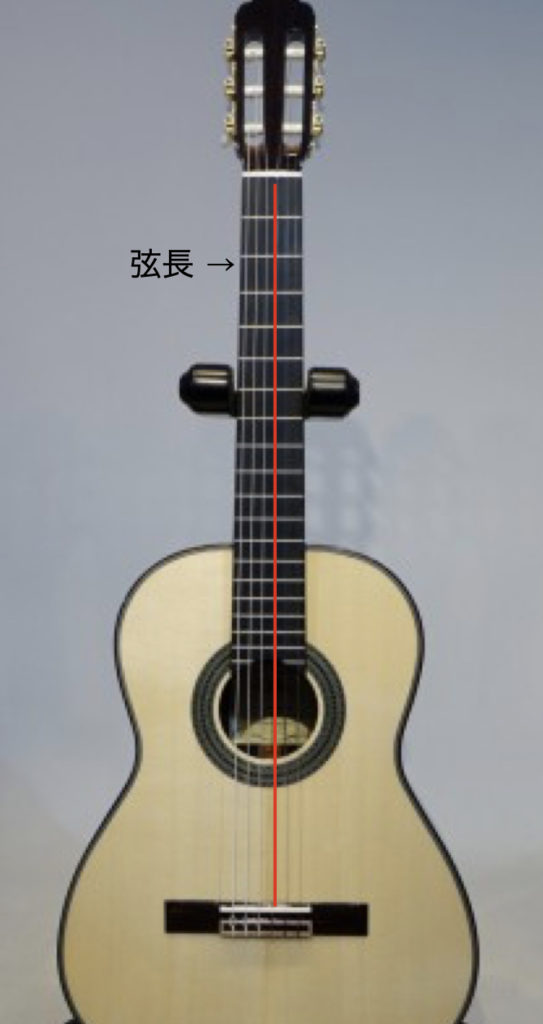 ギターのサイズ(弦長)を記す際は、下記画像の赤線の部分の長さをmmで表します。