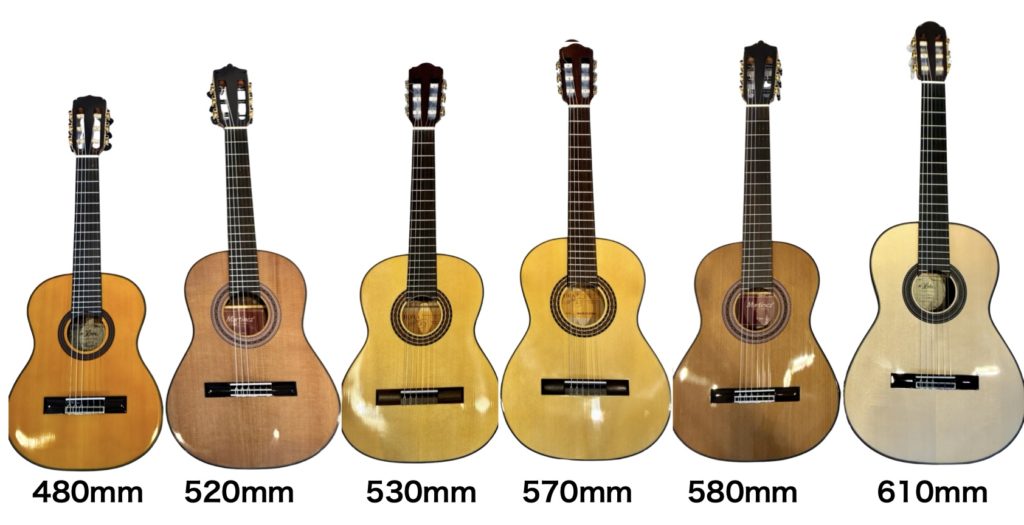 基本的には、弦長(mm)に比例してボディも大きくなっているのですが、今回のラインアップの520mmギターと530mmギターを比べた時、10mm弦長が短いギターのほうが、ボディ1センチ大きい、何てこともあり得ます。